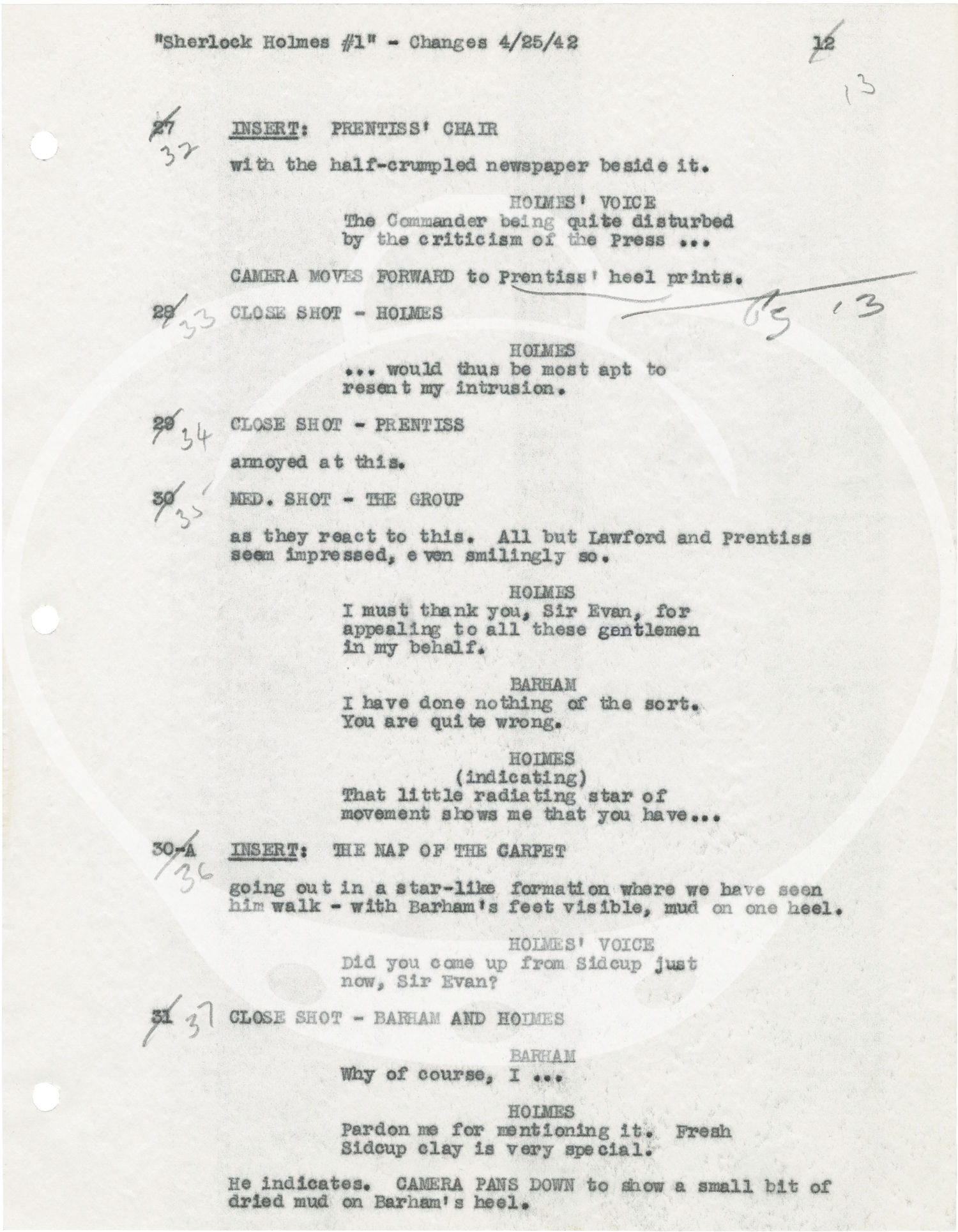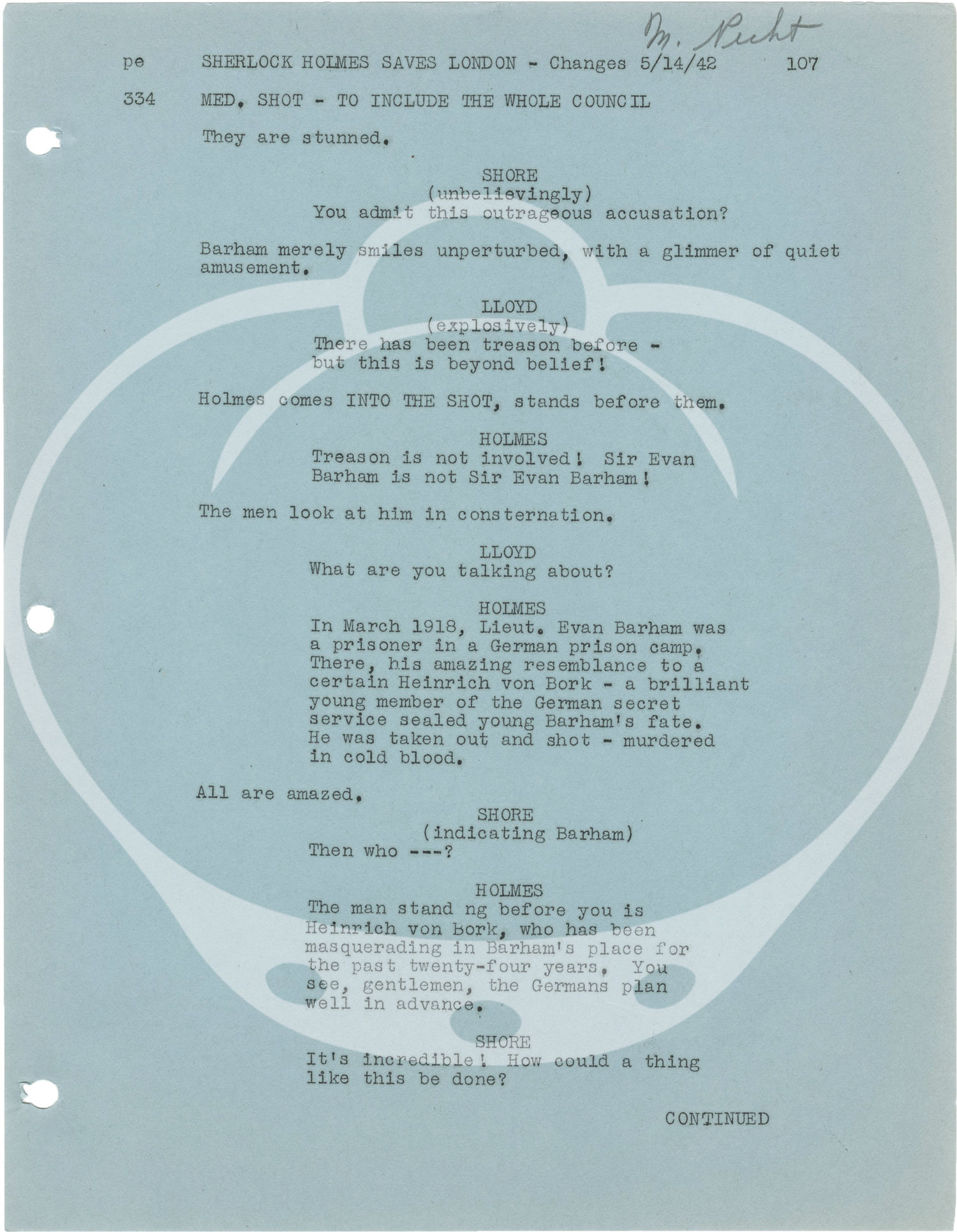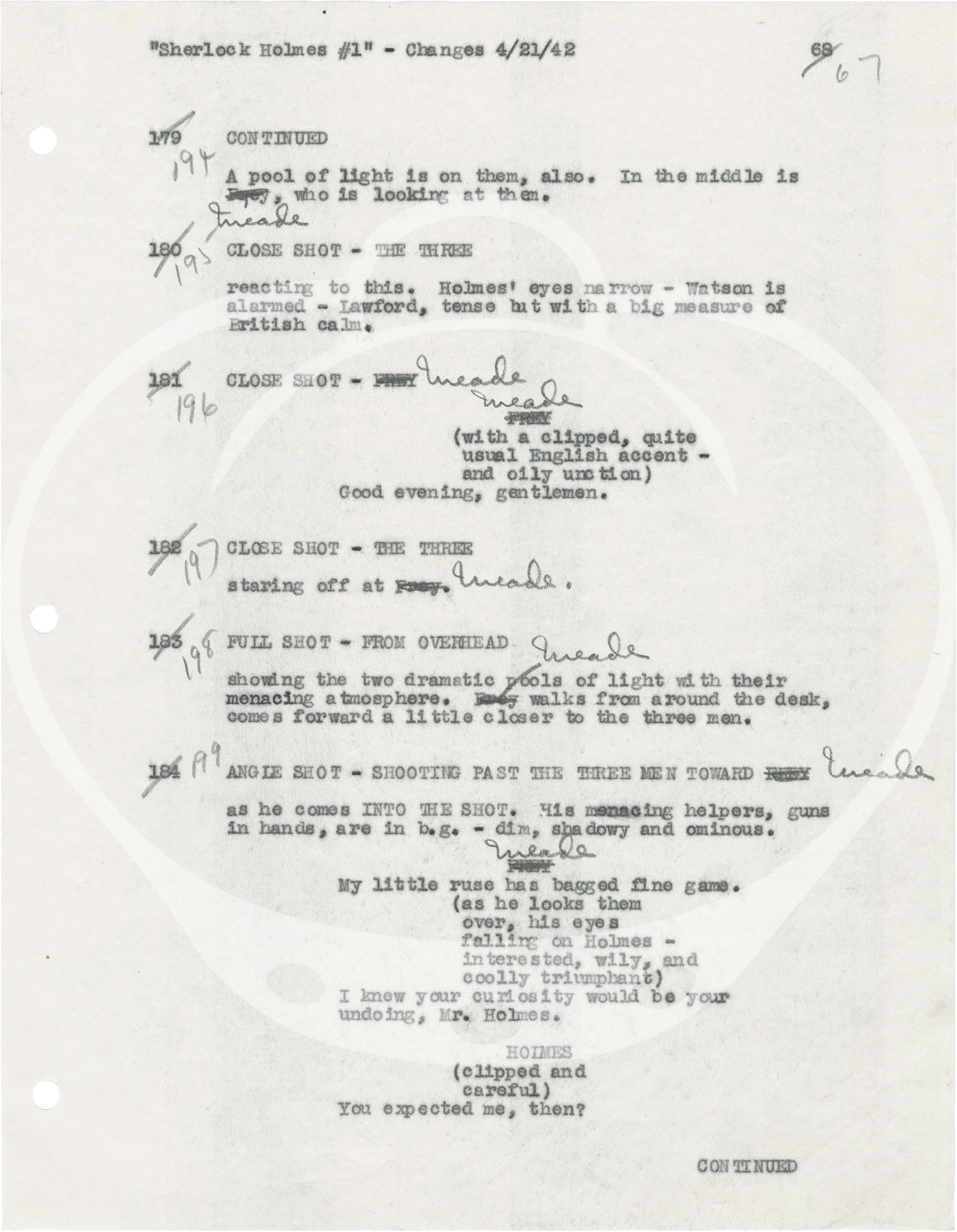 First, an early Draft script, under the working title "Sherlock Holmes vs. Lord Haw-Haw," by screenwriter John Bright, noted as "Contract File Copy" on front wrapper. Carbon typescript, preceded by a four page ribbon copy typescript outline, dated 3/10/42. Annotation of inquiry into necessary story elements and plotline on title page, in manuscript pencil. Several annotations throughout, of Bright's name, page numbers, strikes, question mark, and dates (ranging from 3/10/42 to 3/27/42), in manuscript pencil and ink.