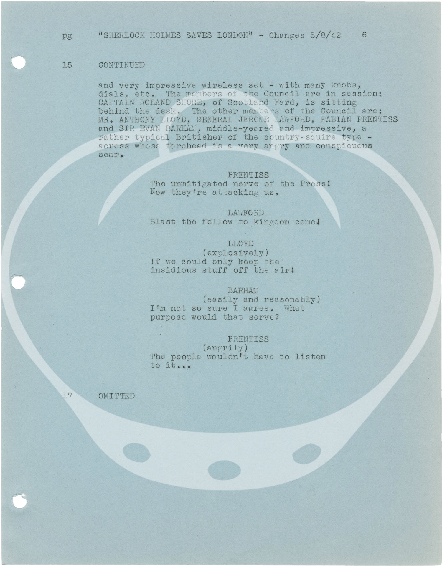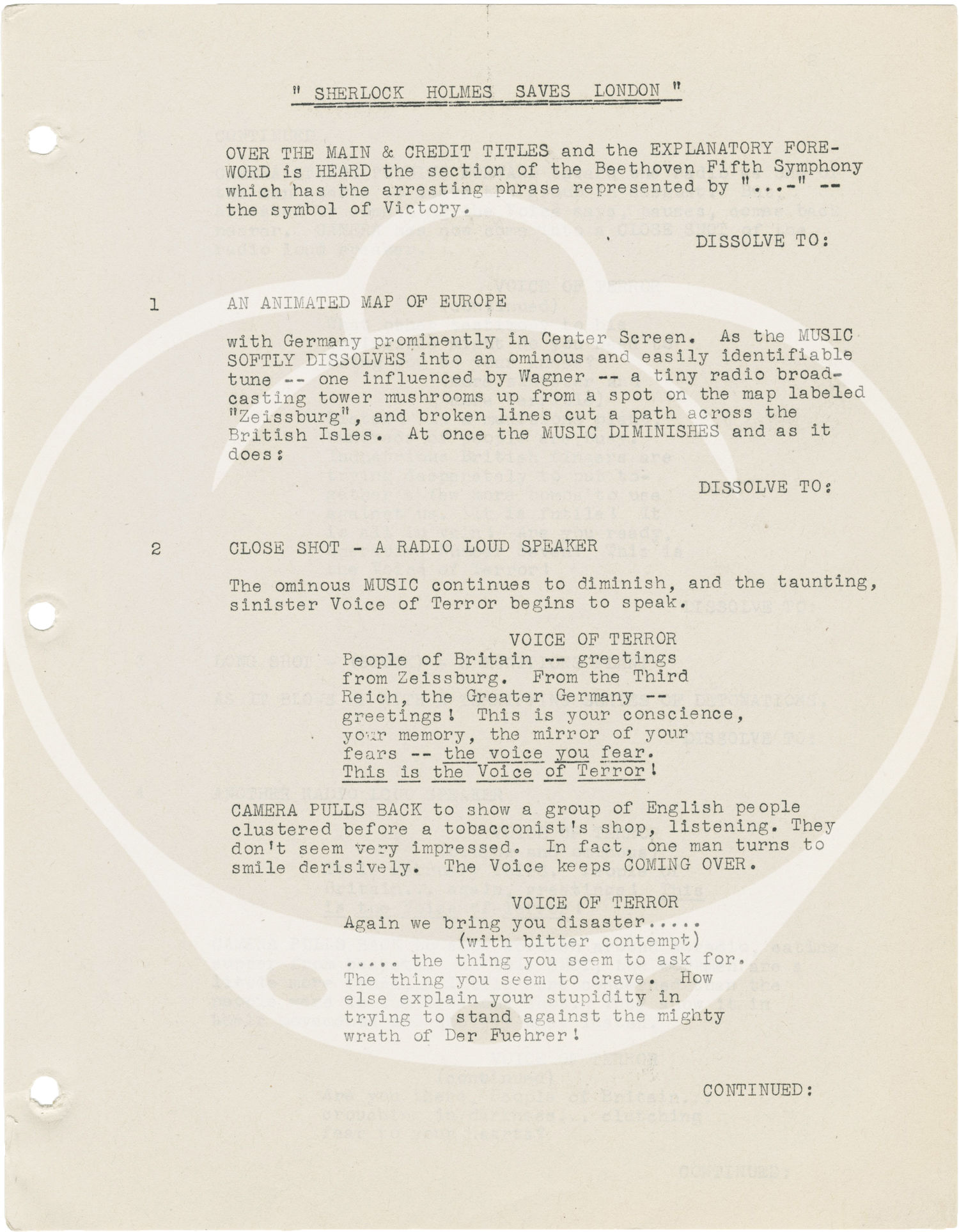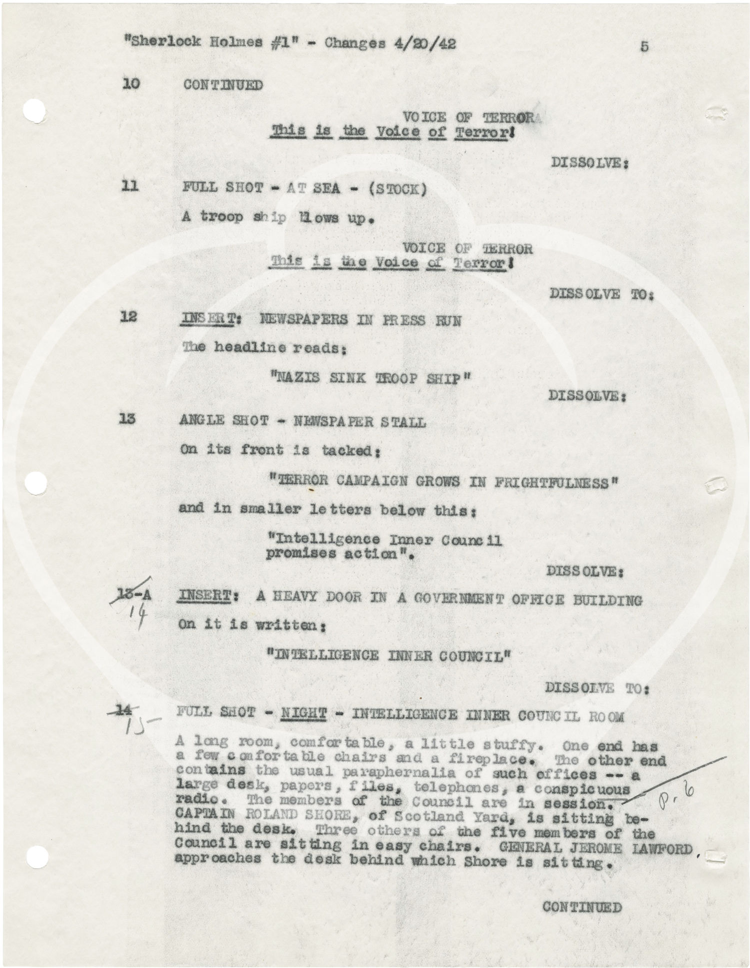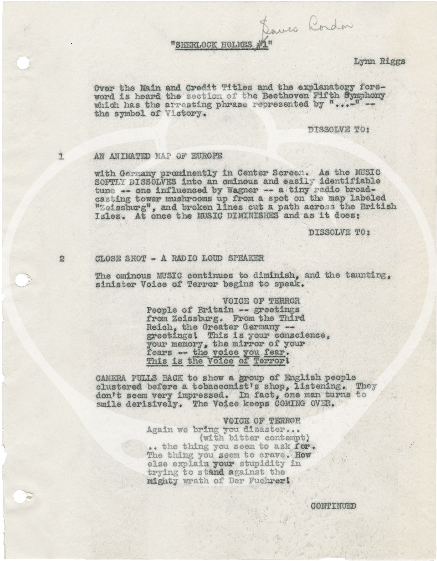 May 4, 1942 script, "Sherlock Holmes' Series #1 'Sherlock Holmes Saves London'":
