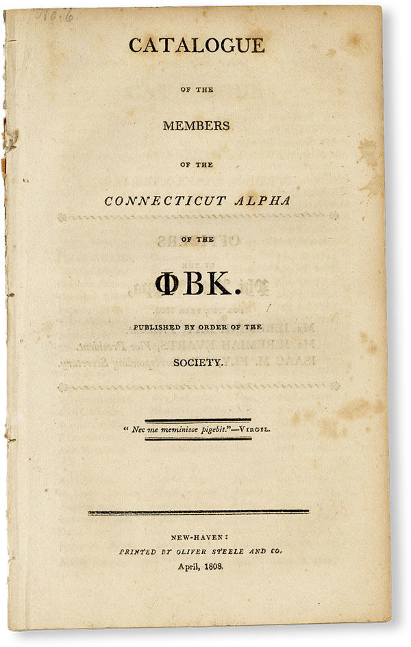 New-Haven: Oliver Steele and Co, 1808. First Edition. Octavo (20.5cm.); removed; 16pp. Light foxing throughout, else Very Good and sound. Catalog includes the members' names, hometowns, college title, and date of admission. SABIN 105908; SHAW & SHOEMAKER 15906.