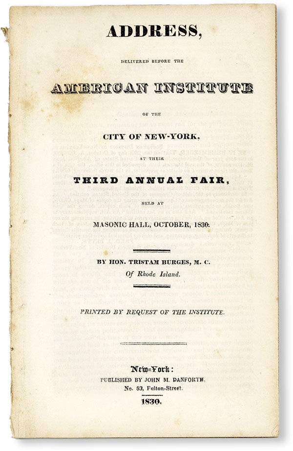 New-York: John M. Danforth, 1830. First Edition. Octavo (20.5cm.); removed; 34pp. Some brief foxing and light wear, else Very Good and sound. Address delivered by the Federalist Representative from Rhode Island at a gathering organized by the American Institute which promoted American agriculture and the arts. At the time Burges was himself deeply involved in the promotion of a protective trade tariff which would eventually cost him reelection. Missed by Sabin. AMERICAN IMPRINTS 707.