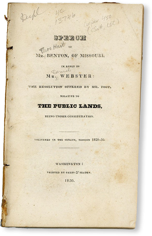 Washington DC: Gales & Seaton, 1830. First Edition. 12mo (18cm.); removed; 74pp. Light foxing and toning to textblock, some brief dog-earing, else Very Good and sound. Speech delivered by long-time Senator from Missouri Thomas Hart Benton (1782-1858) criticizing Daniel Webster's orations while debating South Carolina Senator Robert Y. Hayne over the "Foot Resolution" introduced by Samuel A. Foot to limit the surveying and sale of public lands until land already on the market had been sold. "To defeat the Foot resolution, [Benton] attacked the Webster speech in words he afterward regretted" (DAB). Indeed, Webster's off-the-cuff speeche delivered at the occasion is today considered one of the greatest delivered in Congress. AMERICAN IMPRINTS 450.