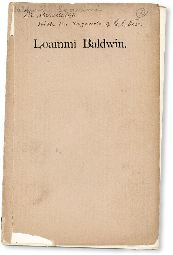 Boston: Geo. H. Ellis, 1885. First Edition. Slim octavo (23cm.); publisher's tan printed wrappers; 28pp. Upper cover separated but present with a few small losses to extremities, some toning and light dust-soil, else Good, internally sound. Inscribed and signed at head of upper cover "Dr. Bowditch with the regards of G.L. Vose." Possibly inscribed to the physician and abolitionist Henry Ingersoll Bowditch (1808-1892), son of Nathaniel Bowditch.