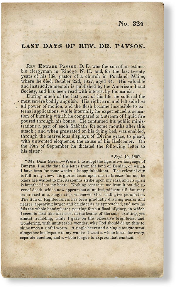 [New York: American Tract Society, n.d., ca. 1835]. 12mo (18cm.); self-wrappers; [8]pp. Light foxing and toning to extremities, else Very Good and sound. Letter written by the American Congregational cleryman to his sister while on his deathbed, dated just a month before his death in 1827. Preceded by a brief biography of his life.