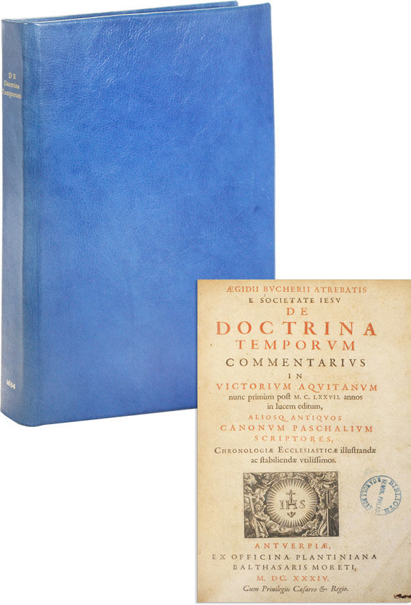 Antverpiæ: Ex Officinia Plantiniana Balthasaris Moreti, 1634 [but 1633?]. First Edition. Folio (32cm.); recent full blue crushed morcco, gilt-lettered spine; xxxii,500pp. (* - 4*4 A-3R4); title page printed in red and black, woodcut initials and head- and tail-pieces. Slightly ex-library with mid-20th century rubberstamp to title page, title page separated but present (and rather browned), new front free endpapers, though retaining original rear free endpaper, else a Very Good, internally sound copy in an attractive and sturdy new binding. At head of title: "Ægidii Bucherii Atrebatis e Societate Iesu." Colophon publication date 1633. The French Jesuit's study of chronological documents in regards to computing Easter dates, partly based on the ancient text the Chronograph of 354.