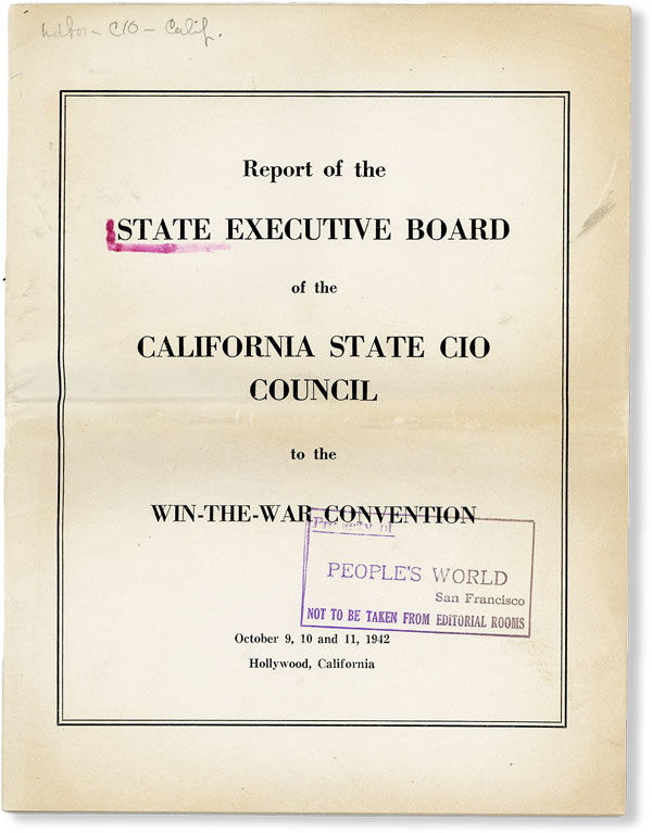 San Francisco: California State CIO, 1942. First Edition. Quarto (28cm.); staplebound self-wrappers printed in double rule; 29pp.; text in double columns. Wrapper extremities toned and rather dust-soiled, old horizontal mail fold, ownership rubberstamp of the Marxist newspaper "People's World," San Francisco, to upper cover, else Good to Very Good overall. Harvard only in OCLC as of June, 2020.