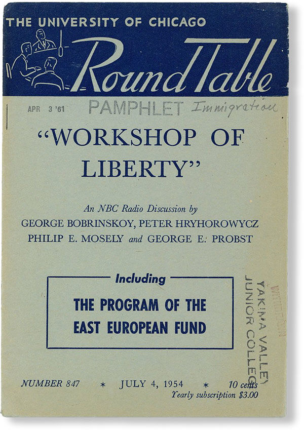 Chicago: University of Chicago, 1954. First Edition. Small octavo (19.5cm.); publisher's green pictorial staplebound wrappers printed in blue; 15pp. Ex-Yakima Valley Junior College with their usual markings, extremities a bit worn, upper cover toned to grey; Good to Very Good overall. Transcript of an NBC radio discussion on the history of immigration in America by George Bobrinskoy, Peter Hryhorowycz, Philip E. Mosley, and George E. Probst.