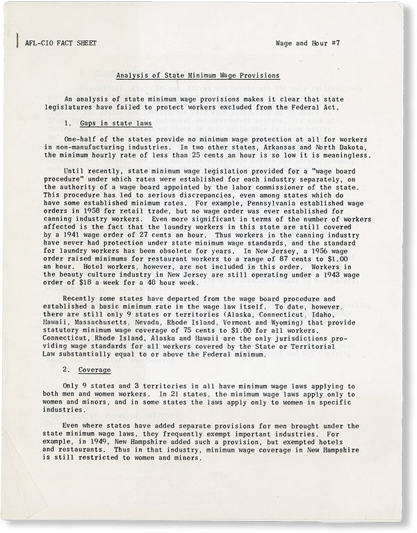 N.p.: AFL-CIO, 1958. First Edition. Quarto (27.5cm.); side-stapled self-wrappers; 2ll. printed on rectos only & 2,2,2,2pp.; printed from typescript. Minor wear from handling, else Very Good or better. AFL-CIO Fact Sheet - Wage and Hour No. 7. Not separately catalogued in OCLC as of May, 2020.