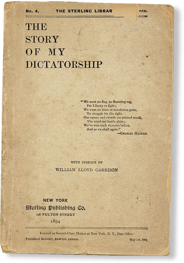 New York: Sterling Publishing Co, 1894. First American Edition. 12mo (18.5cm.); publisher's grey printed wrappers; iv,[2],133,[21](ads)pp.; illustrated ads in rear. Wrapper and textblock exceedingly brittle, some small losses to extremities affecting text with brief loss of meaning, stock quite browned, last few leaves of advertisements chipped with some loss of meaning. Good only overall due to poor paper quality. Henry Georgist utopian novel first serialized in "Our Commonwealth" (Adelaide, Australia), a newspaper published by Ignatius Singer to promote land nationalization and the single tax. The work describes an anonymous narrator's experiences after being elected dictator of England and his activities promoting Georgist tenets, though the tale ends rather abruptly when it is revealed that it was all a dream. (See Lyman Tower Sargent, "Michael Flürscheim: From the Single Tax to Currency Reform," in "Utopian Studies," Vol. 21, no. 1 (2010), p. 160.) For other editions see Negley 89 and Sargent, p. 56.