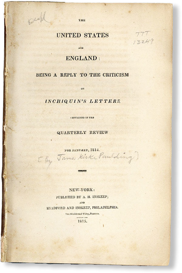 New-York: A.H. Inskeep, 1815. First Edition. Issue A. Octavo (20.5cm.); removed; 115pp. Light toning and foxing to textblock, last leaf of text nearly separated, else Very Good. Attack on Great Britain written in response to a series of unflattering articles written by Charles Jared Ingersoll following a trip to the United States. In turn Paulding portrays Great Britain "as a degenerate, despotic kingdom, burdened by parasitical aristocracy, and jealous of America's success (J. Eaton, "The Anglo-American Paper War" (2012), p. 73). BAL 15692; HOWES P136; SABIN 59215; SHAW & SHOEMAKER 35575.
