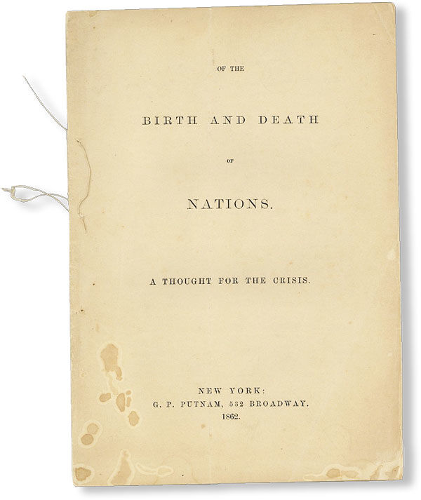 New York: G.P. Putnam, 1862. Offprint. Octavo (19.5cm.); sewn self-wrappers; 33pp. Stitching snapped and signatures separated, brief soil to upper cover, faint creases and tiny loss at bottom fore-edge corner; Good or better only. Article attributed to a founding member of the American Freedmen's Inquiry Commission, formed the following year to investigate the status of slaves newly freed by the Emancipation Proclamation. SABIN 43370, noting this article was first published in the "Rebellion Record.