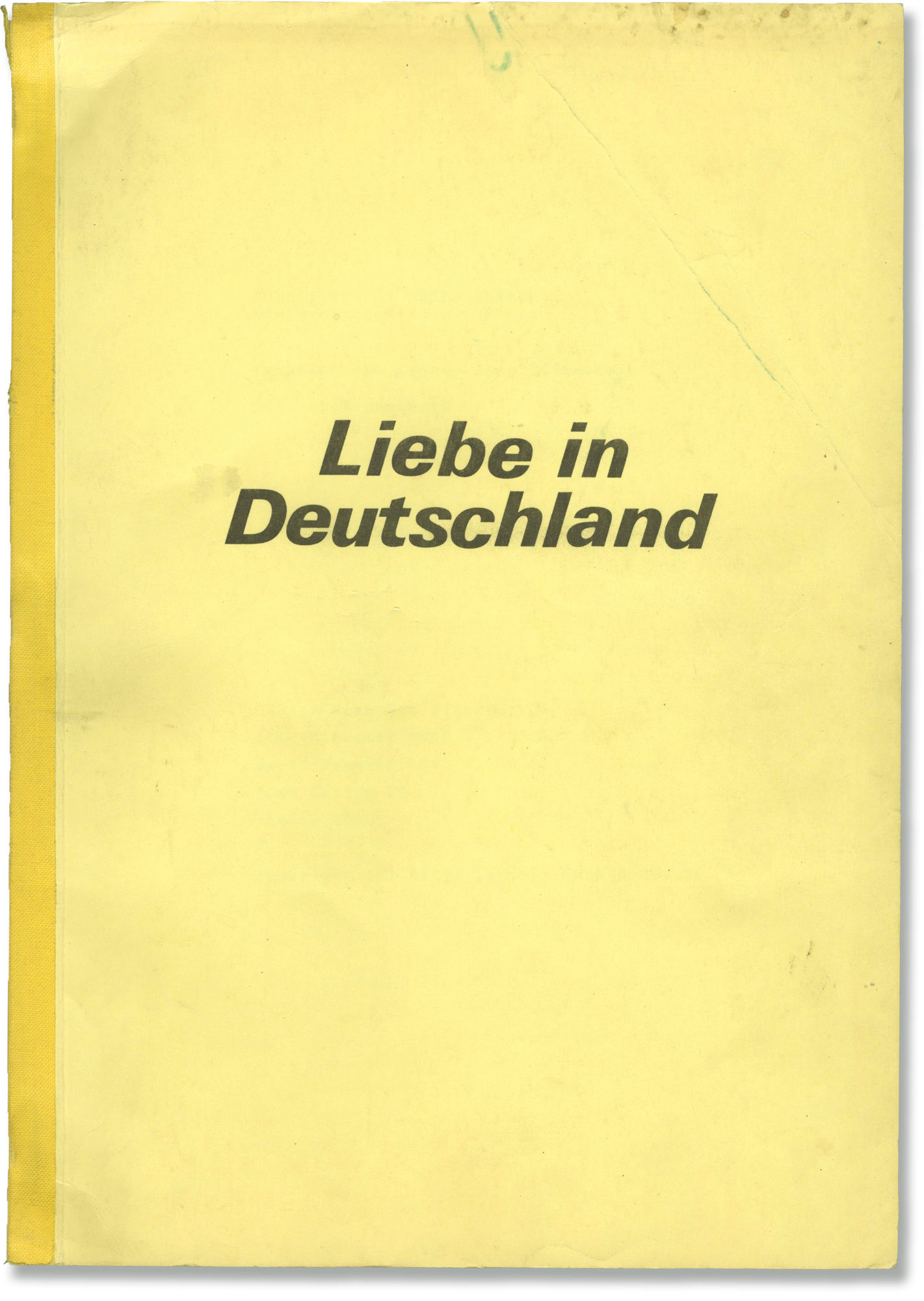 Yellow titled perfect-bound wrappers. Title page present, dated Januar 1980, with credits for screenwriters Rolf Hochhuth and Werner Jorg Luddecke. 216 leaves, with last page of text numbered 210. Xerographic duplication, rectos only. Pages Near Fine, wrapper Very Good plus.