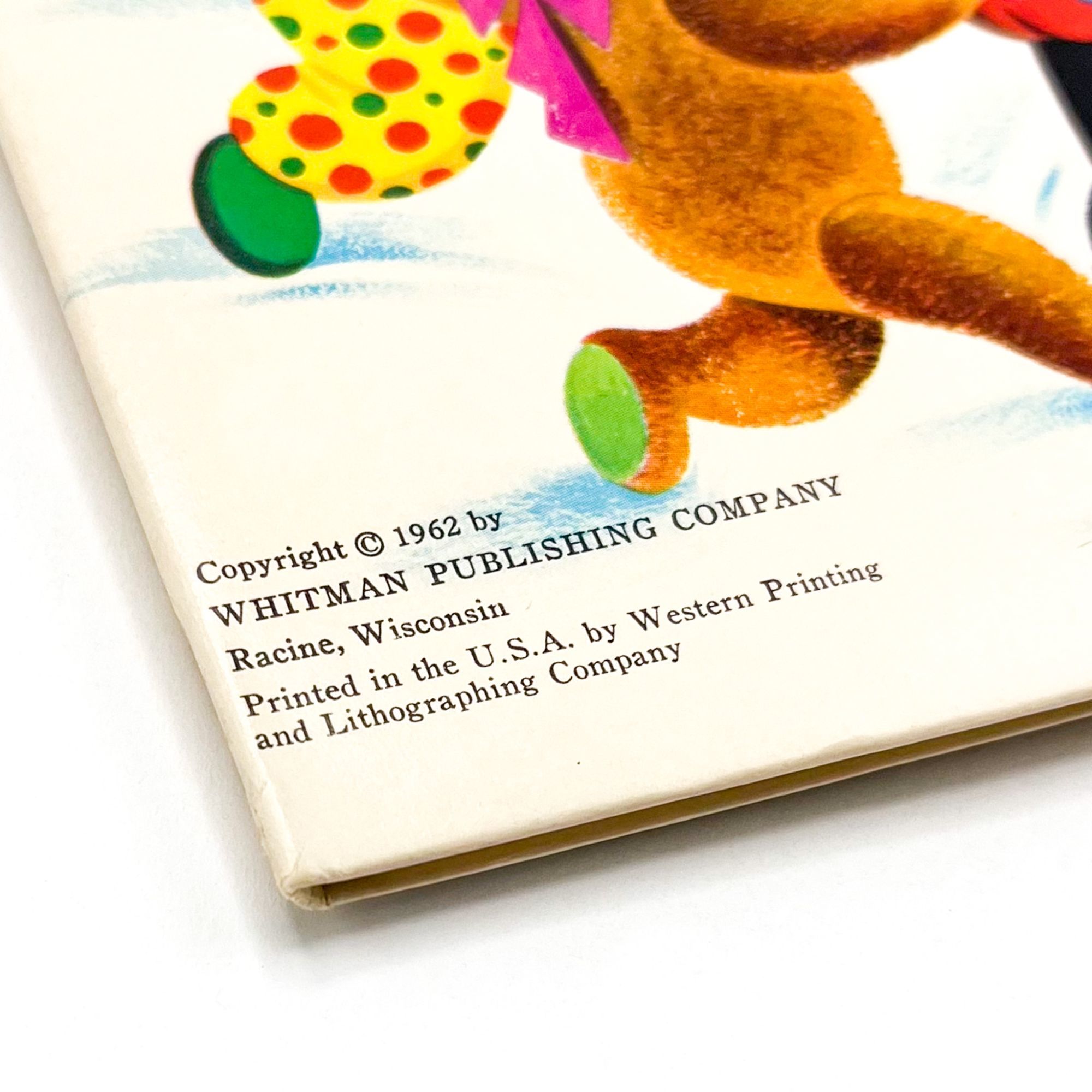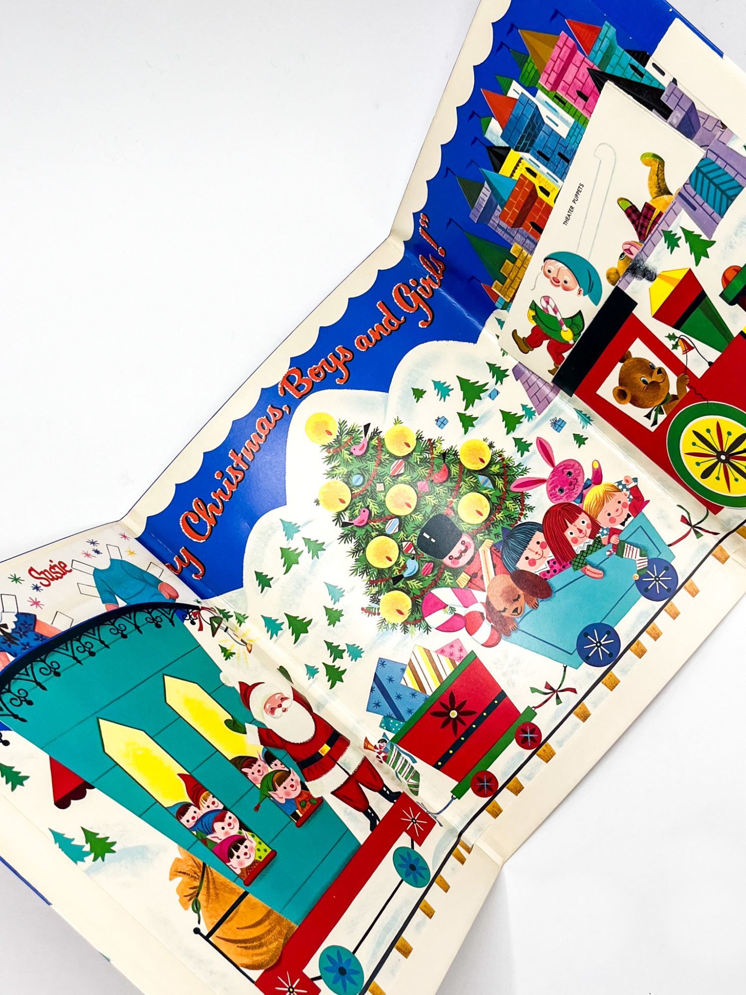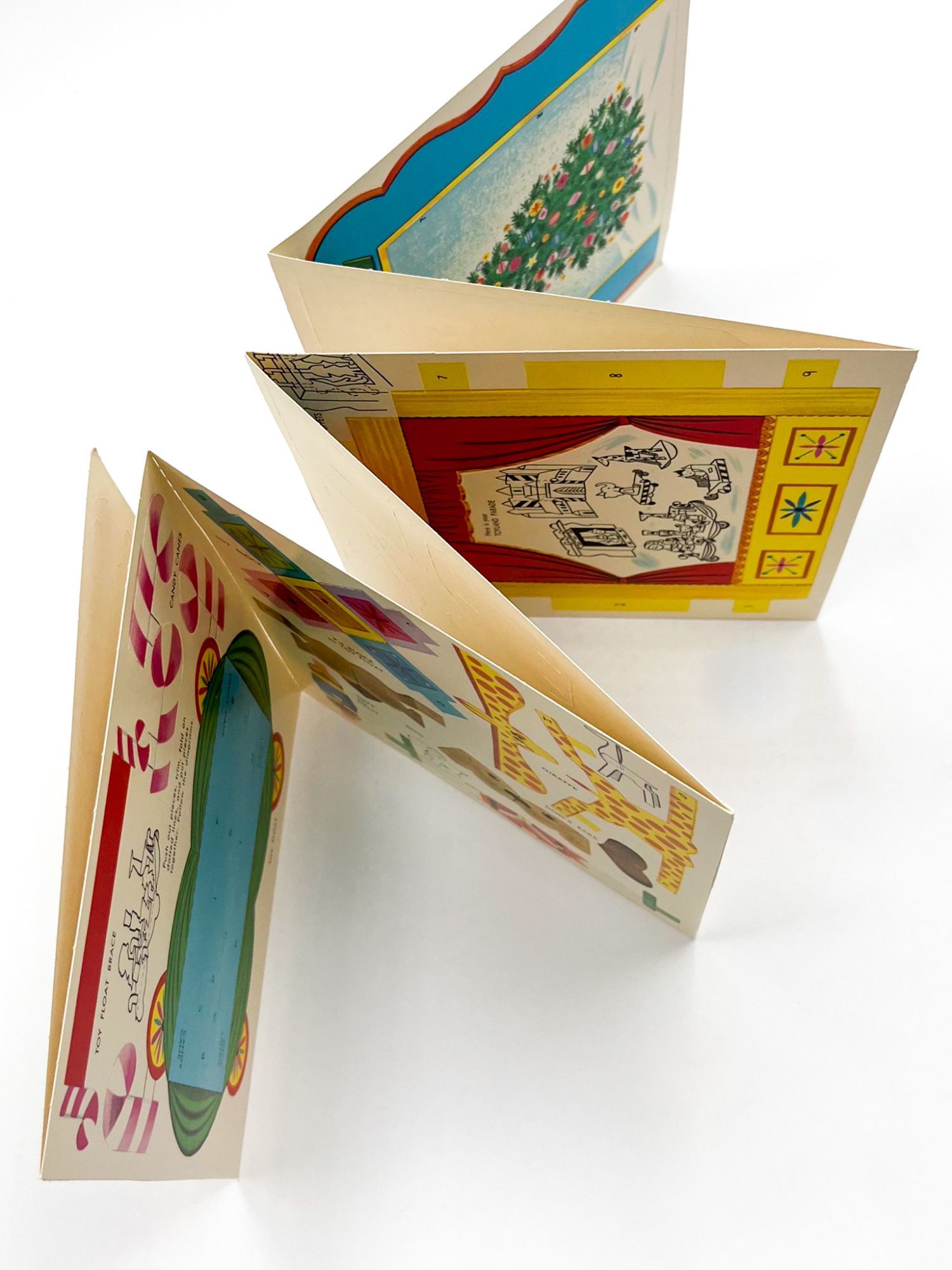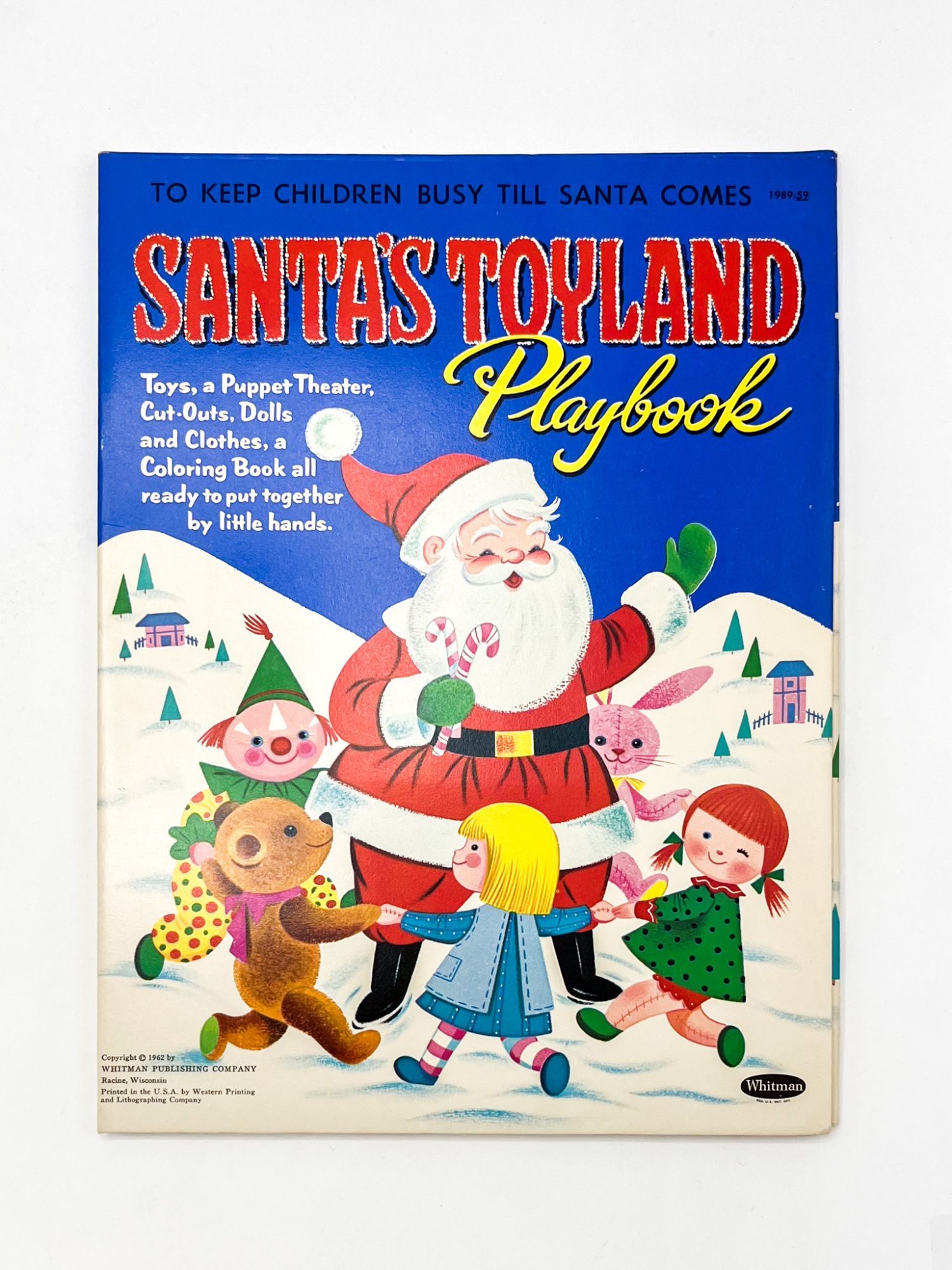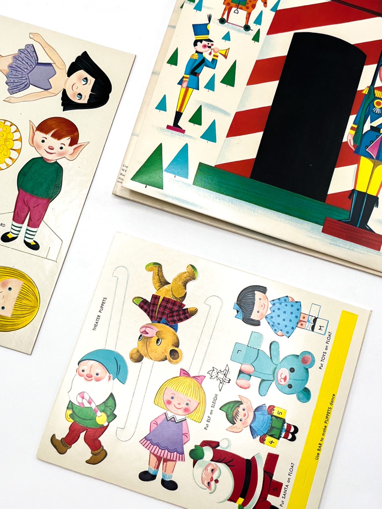 Racine: Whitman, 1962. Fine.. Unused 3-panel Christmas themed activity book, illustrated in an exuberant early 1960s style. Two of the panels contain pockets that hold activity items "To keep children busy until Santa comes." Included are: a puppet theater, cut outs, paper dolls and clothing, and a coloring book that the child cuts out and makes into a book. 12'' x 9''. Original flexible pictorial card covers. Illustrated in color on all sides. Touch of edgewear.