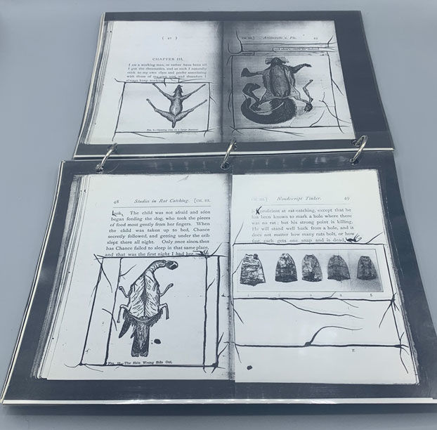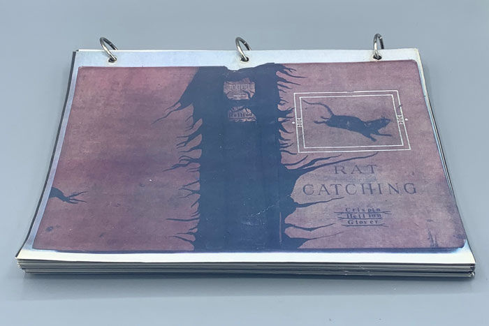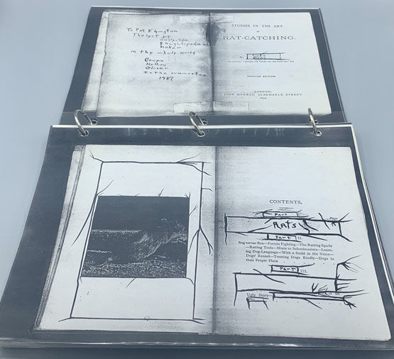 Quarto [28 cm] Photocopy of a mockup photo collage. Bound with three metal rings. Seemingly the plans for the conceptual art book that Glover would publish in 1988, "Rat Catching." Glover's "Rat Catching" was based on an 1896 edition of "Studies in the Art of Rat-Catching" by H. C. Barkley. Here, in this odd mockup, one is presented with a succession of photocopied pages representing Glover's artistic manipulation of the 1896 edition of "Studies in the Art of Rat-Catching" by H. C. Barkley. In this photocopy, Glover has crossed the original author's name out and replaced it with "Crispin Hellion Glover." Crispin plays with the original contents of the book throughout adding sketches and notations.