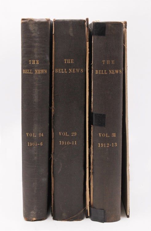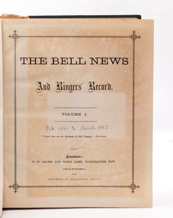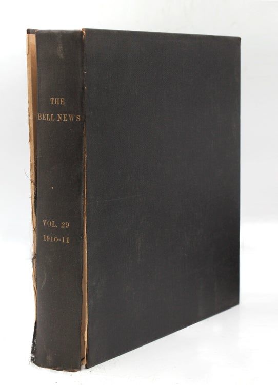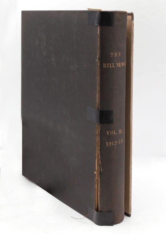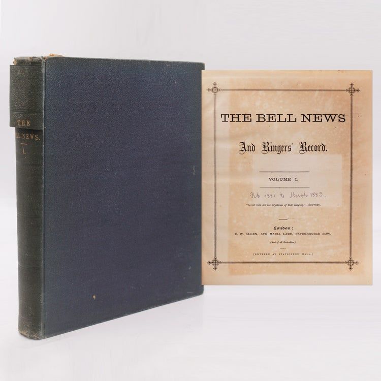 London, 1914. 32 vols. 4to. Cloth. Some wear, spines of vols. 1-4 worn; boards of two vols. detached (29 & 31). Bookplate of Arthur H. Nichols in many vols. With index volume compiled by Cecil Wratten (Alan R. Ellis, 2002). 32 vols. 4to. A massive and nearly complete run of this weekly bell-ringing resource, published in London from 1881 to 1915. OCLC records only copies in the British Library and the National Library of Scotland. OCLC : BL (503907612) & NLS (266039208)