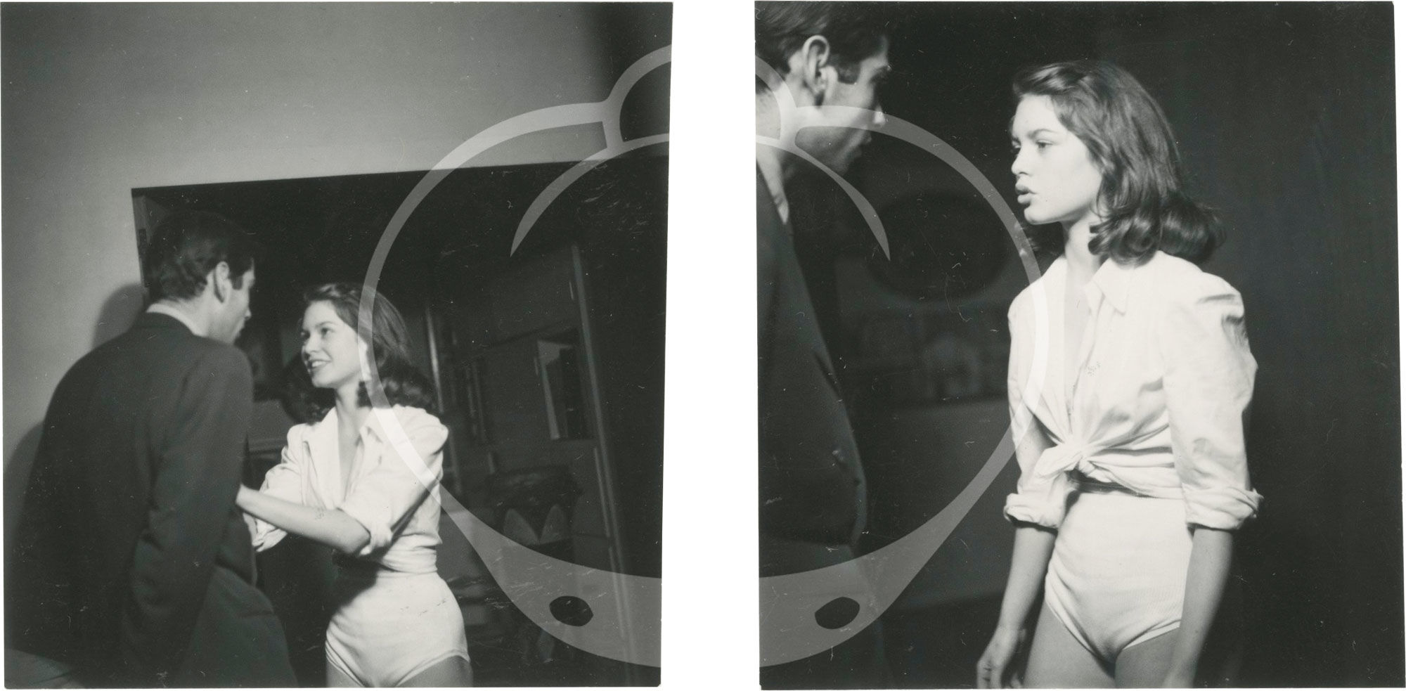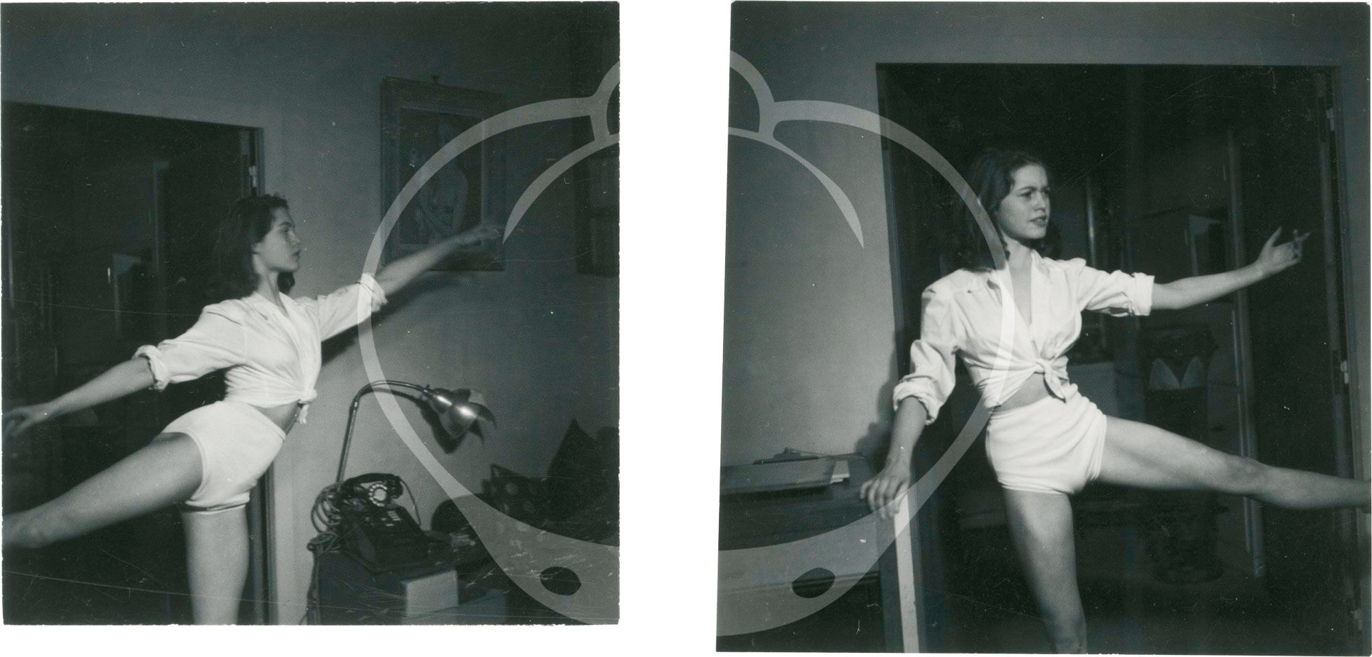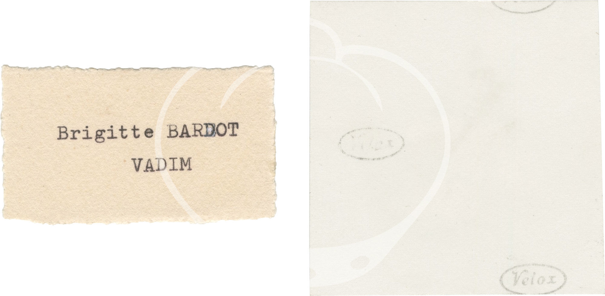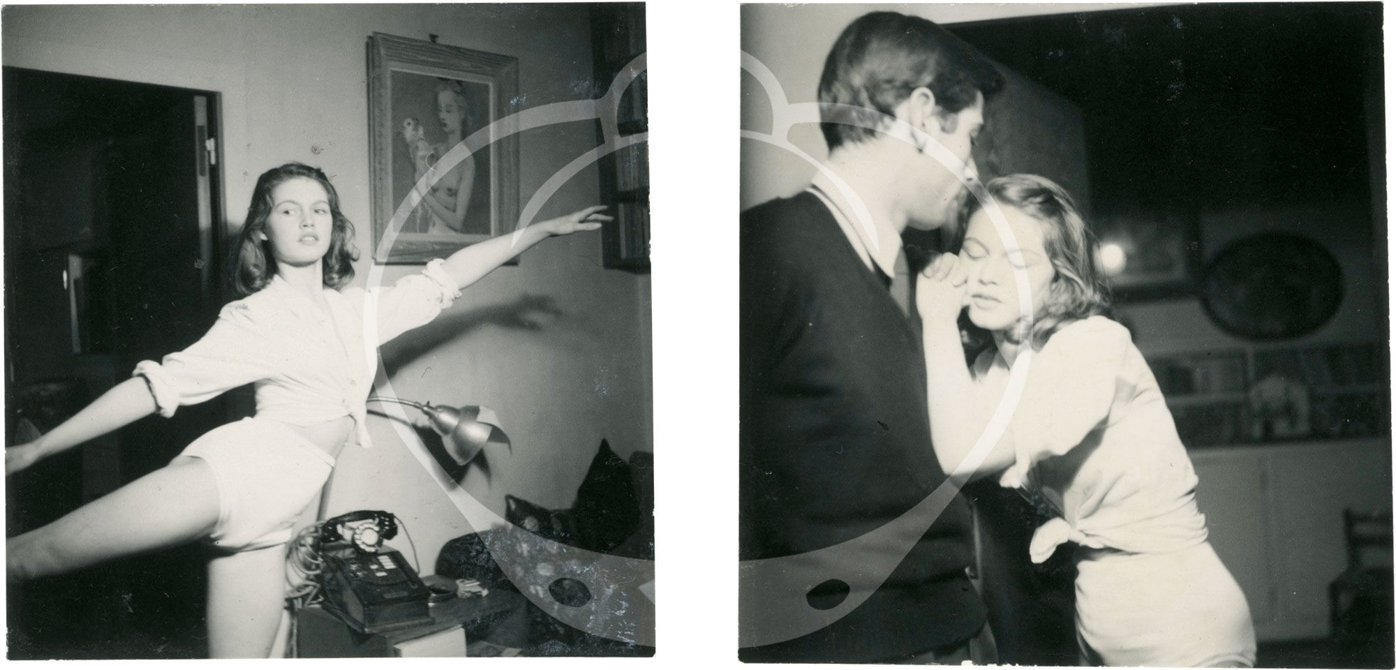 N.p.: N.p., 1950. Eight vintage small format borderless candid photographs of a young Brigitte Bardot practicing arabesque ballet moves, relaxing, and with husband Roger Vadim, in what appears to be their apartment. Photographs attributed to Marc Allegret, circa 1951. Printed on Kodak Velox paper, with a small detached ribbon copy snipe of "Brigitte BARDOT / VADIM."