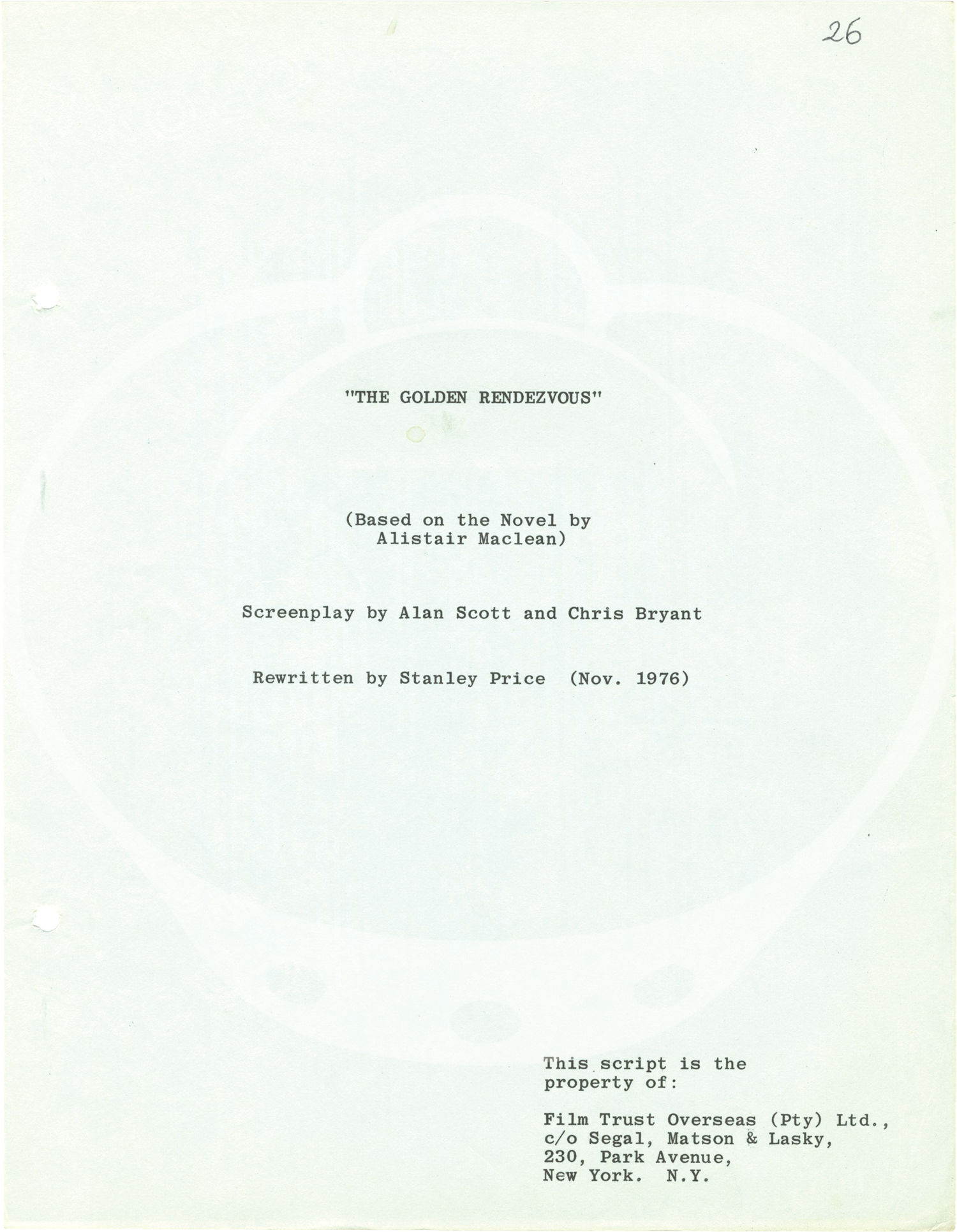 Mustard untitled wrappers with a die-cut title window in the British style. Title page present, dated Nov. 1976, with credits for novelist Alistair Maclean and screenwriters Alan Scott and Chris Bryant, with rewrite credits to Stanley Price. 135 leaves, with last page of text numbered 130. Mimeograph duplication on eye-rest green stock, rectos only. Pages Near Fine, wrapper Very Good plus, with several partial ring stains on the front wrapper, bound internally with two silver brads.