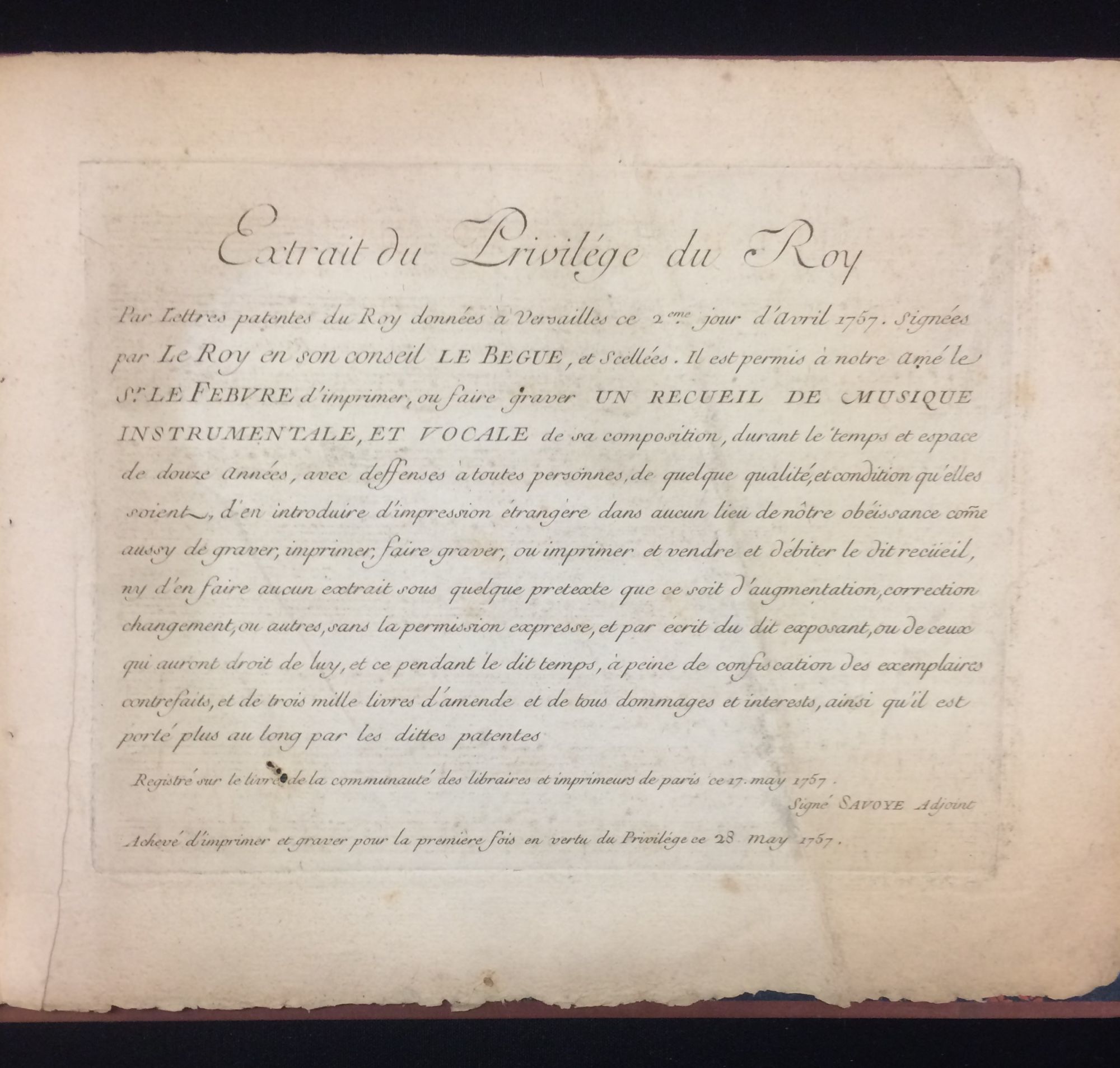 Paris: A Paris chez l'auteur quay de Bourbon Isle St Louis a` co^te? de l'ho^tel de Jasso. Mr Bayard rue? St Honore? a` la Regle d'or. Mr Le Clerc rue? du Roule a` la Croix d'or. Mlle Castagneri rue? des Prouvaires a` la Musique royalle, 1757. 1st or early edition. Hardcover. Very Good. Choral score for a chamber piece by Lefebve, 9 oblong sheets folded once to double-sided 36 - title page, 30 pages of musical score, Royal statement. Leaves have been excised from a larger volume, the music choral score paginated 121 - 150. The "Extrait du Privilege du Roy" grants exclusive rights to the printers to publish Lefebvre's work, proclaimed 17 May 1757 and issued 28 May 1757. (Unauthorized use carries a fine of 3000 pounds!). Musical sheets have untrimmed edges, soiled about edges. Laid-into an oblong folder of fine brown linen-covered boards and floral-patterned French endpapers probably 19thc. Lefebvre (c1700 - 1763) was a French composer and organist at the royal church of St. Louis-en-l'Isle (as he is identified on the title page here). He composed mostly vocal music, mostly motets, airs and cantailles for which he was popular in Paris. We could find only 2 copies of choral works in French (most in Latin) acribed to Lefebvre that postdate 1757, both at the Biblotheque Nationale de France.