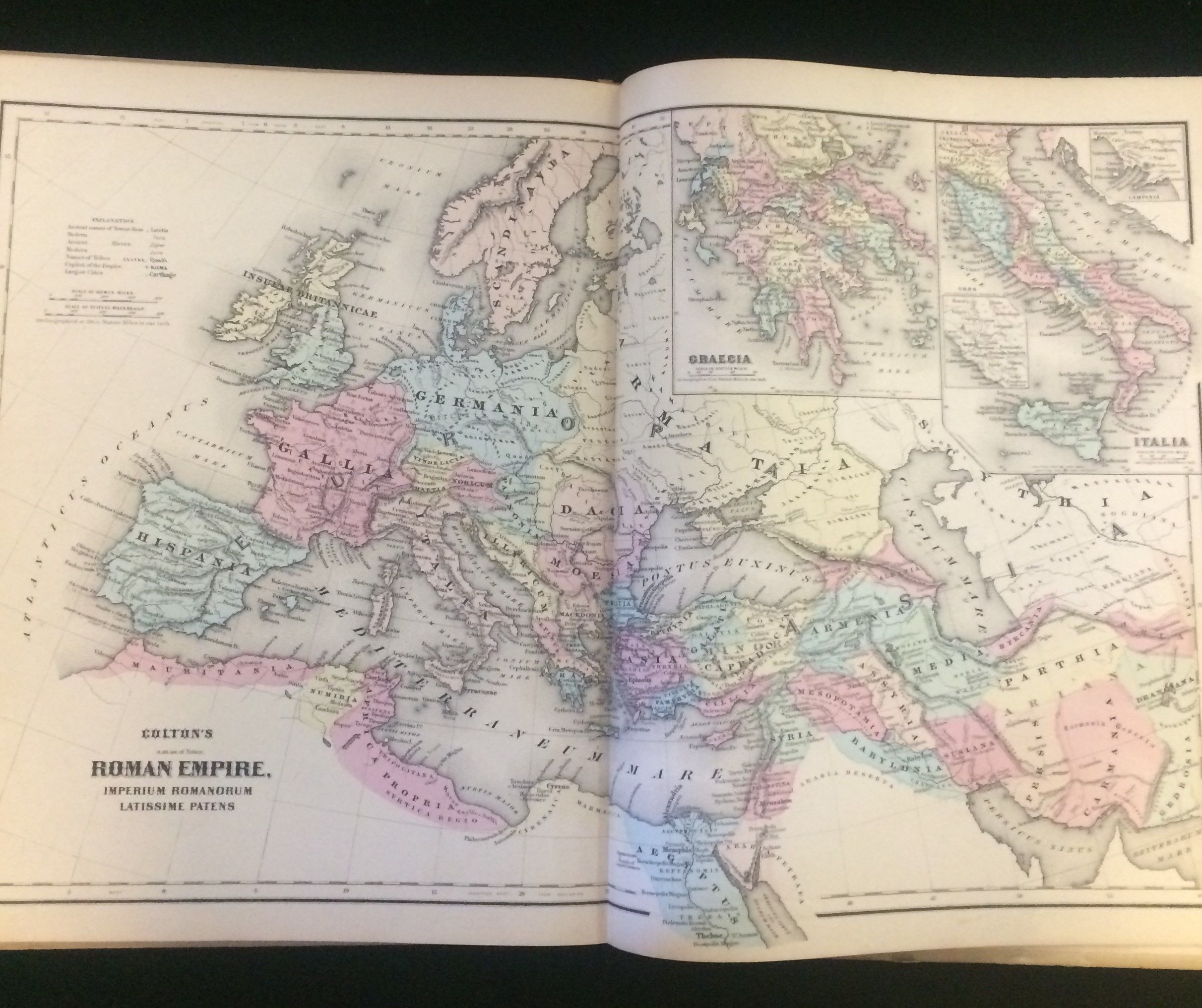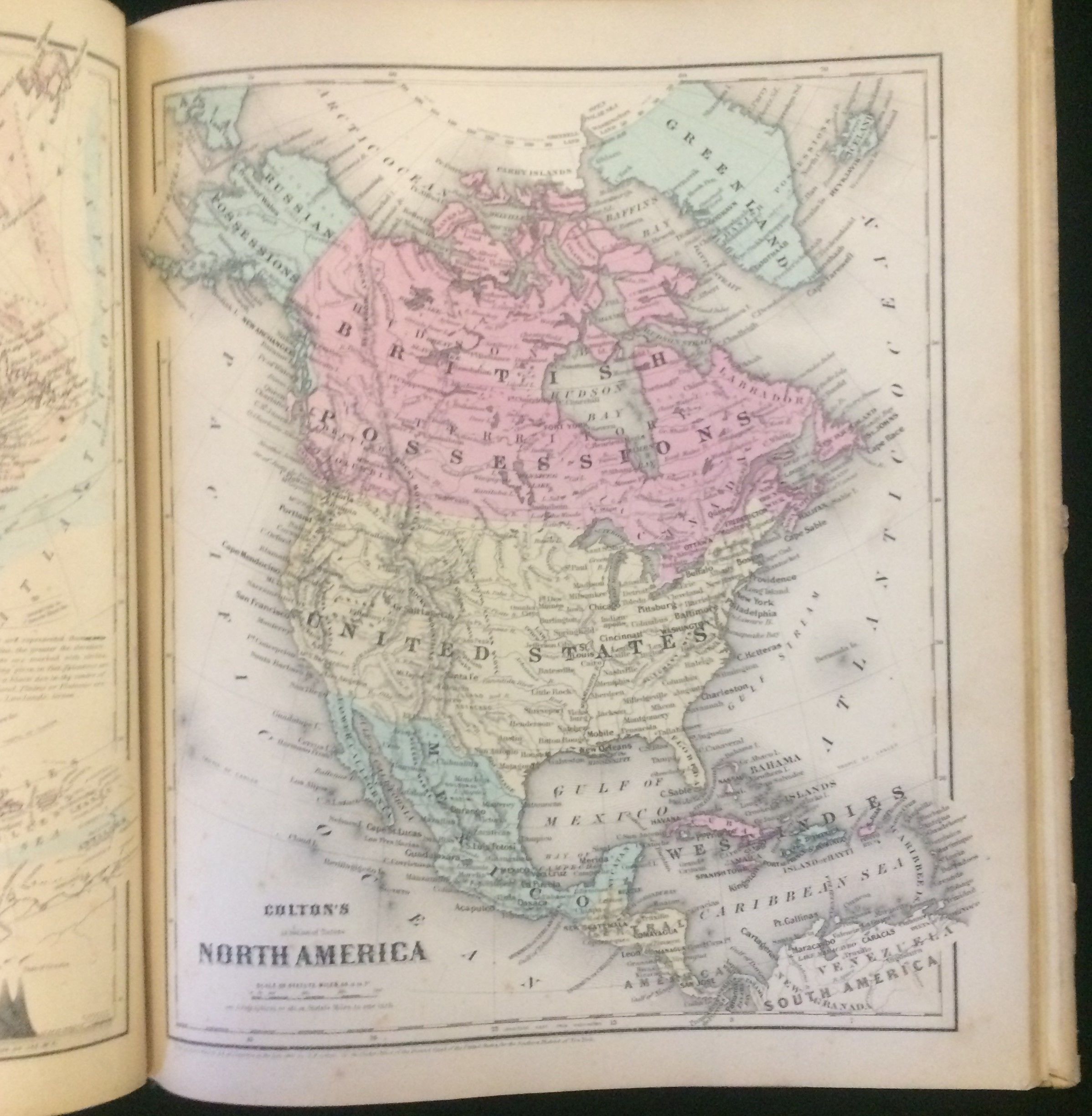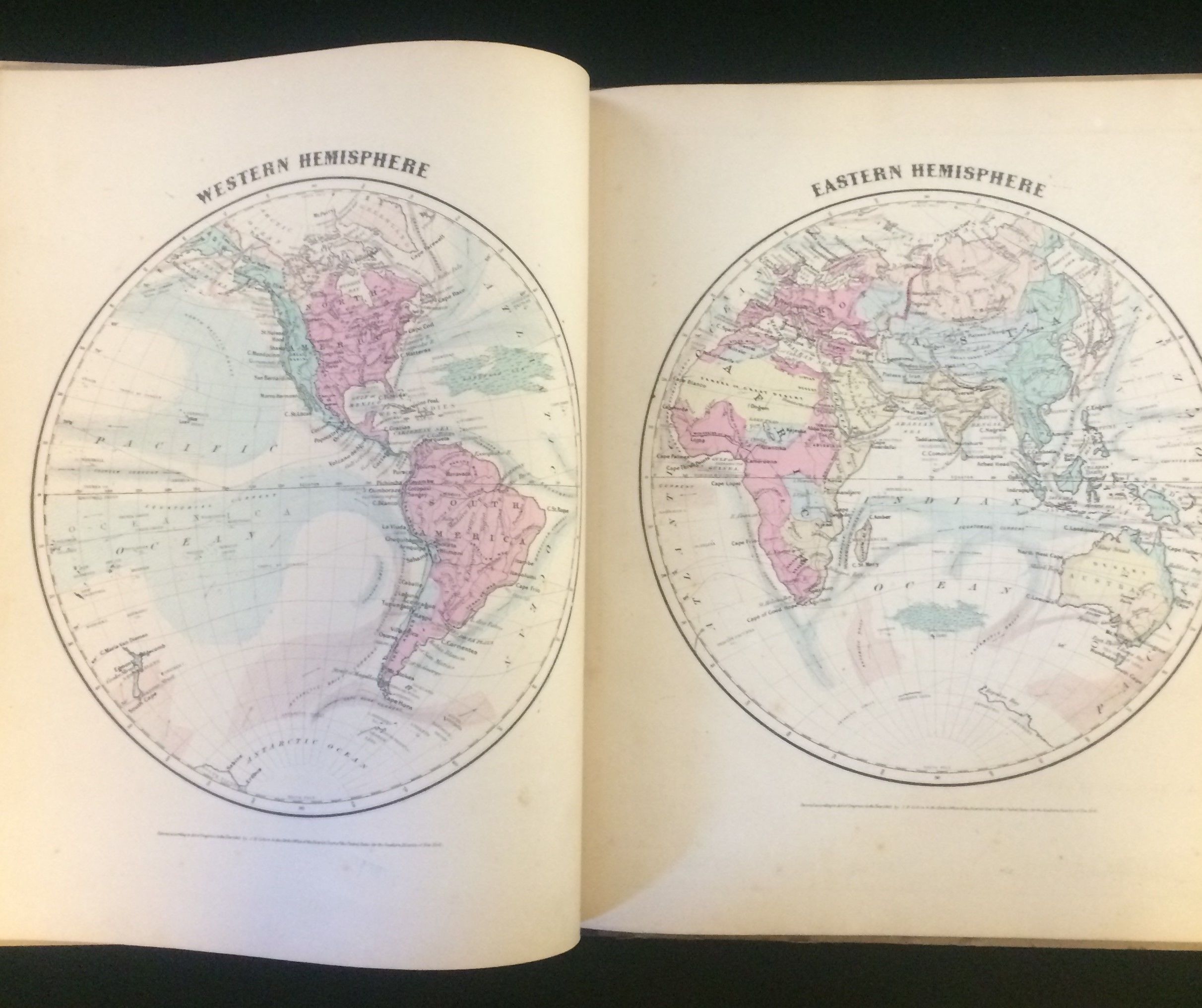 NY: Ivison, Phinney & Co, 1860. 1st Edition. Hardcover. Very Good +. A very well preserved copy in original pictorial paper, brown cloth spine. Large 4to, 11 pages of text and charts, 35 full page colored maps, the last double-truck. Cover states the atlas is "designed to accompany Colton's American School Geography". The covers are soiled with shallow loss head of spine. Insides shows little if any signs of use. Rear cover is a publisher list titled at top "The American Educational Series" Original owner's name in florid contemporary script dated 1865 on the ffe. A solid, unsophisticated copy.
