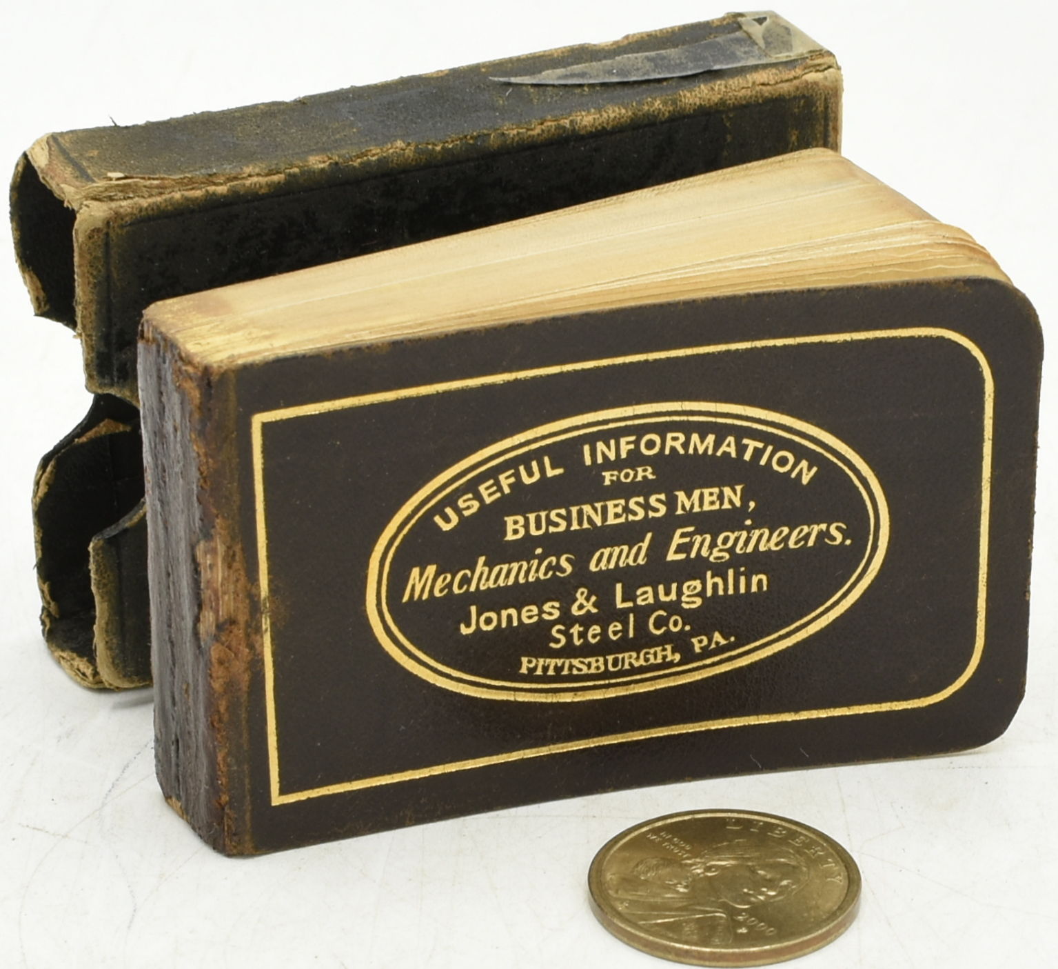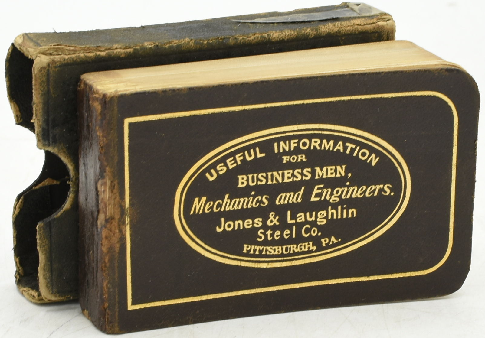 Pittsburgh, PA: Jones & Laughlin Steel Co, 1907. Sixteenth Edition. Full Leather. Very Good binding/Fair dust jacket. A miniature pocket book of Useful Information, published by the Jones & Laughlin Steel Company. A true miniature, it is small enough to fit in a vest pocket yet exhaustively comprehensive, with everything a mechanic or engineer might desire; it includes charts of safe load weights for different steel beams, illustrations of various pulley types, how to estimate elevation by boiling water, and even emergency first aid (if it can be found in time within the 492 pages). Remnants of old scotch tape repair to the edges of the worn slipcase. Flexible, oblong, leather binding, with surface loss to the spine and rubbing to the gilt edges of the textblock. Lettering and decoration stamped in gilt on the front and in blind on the rear. 4.5 x 7.5 cm. Very Good binding / Fair dust jacket.