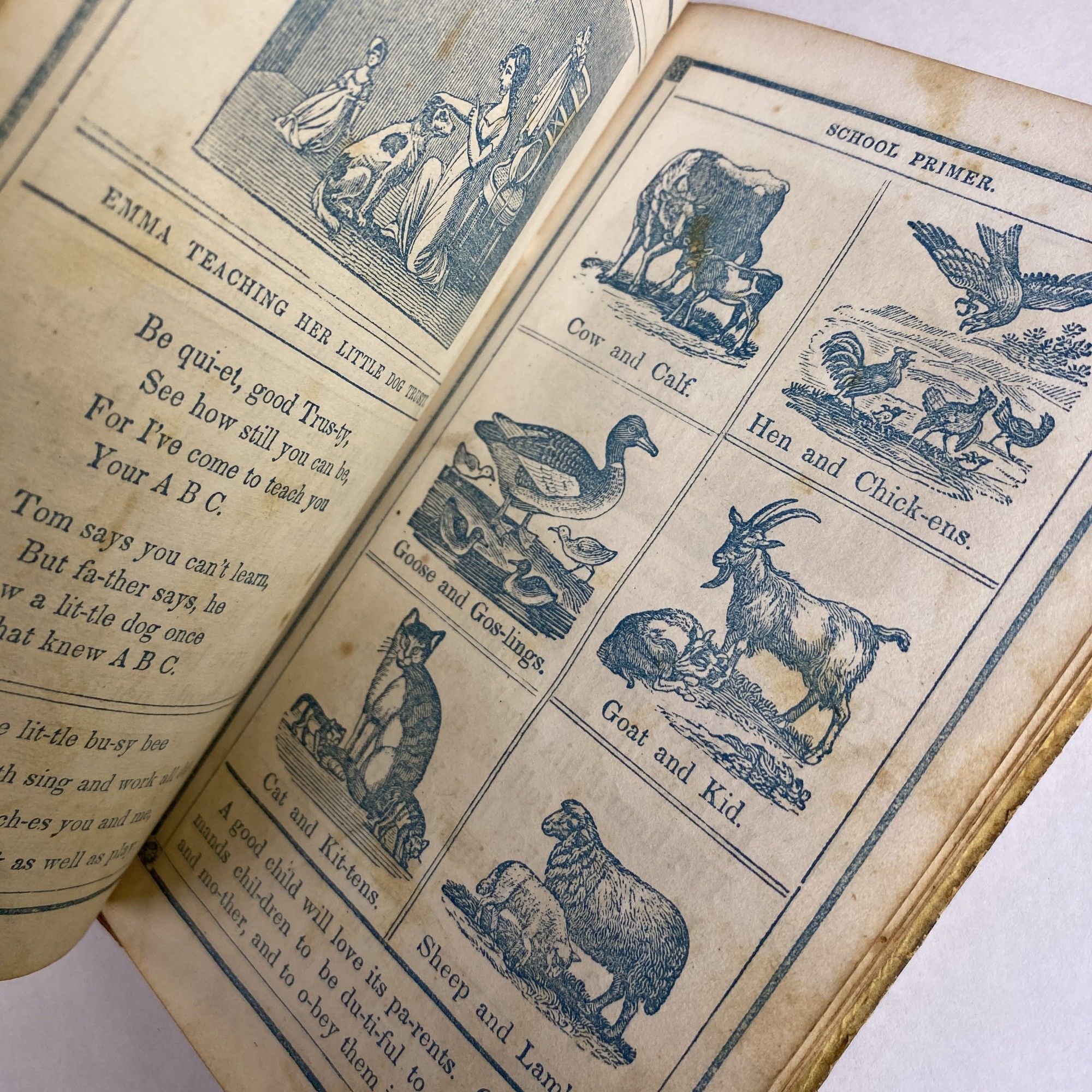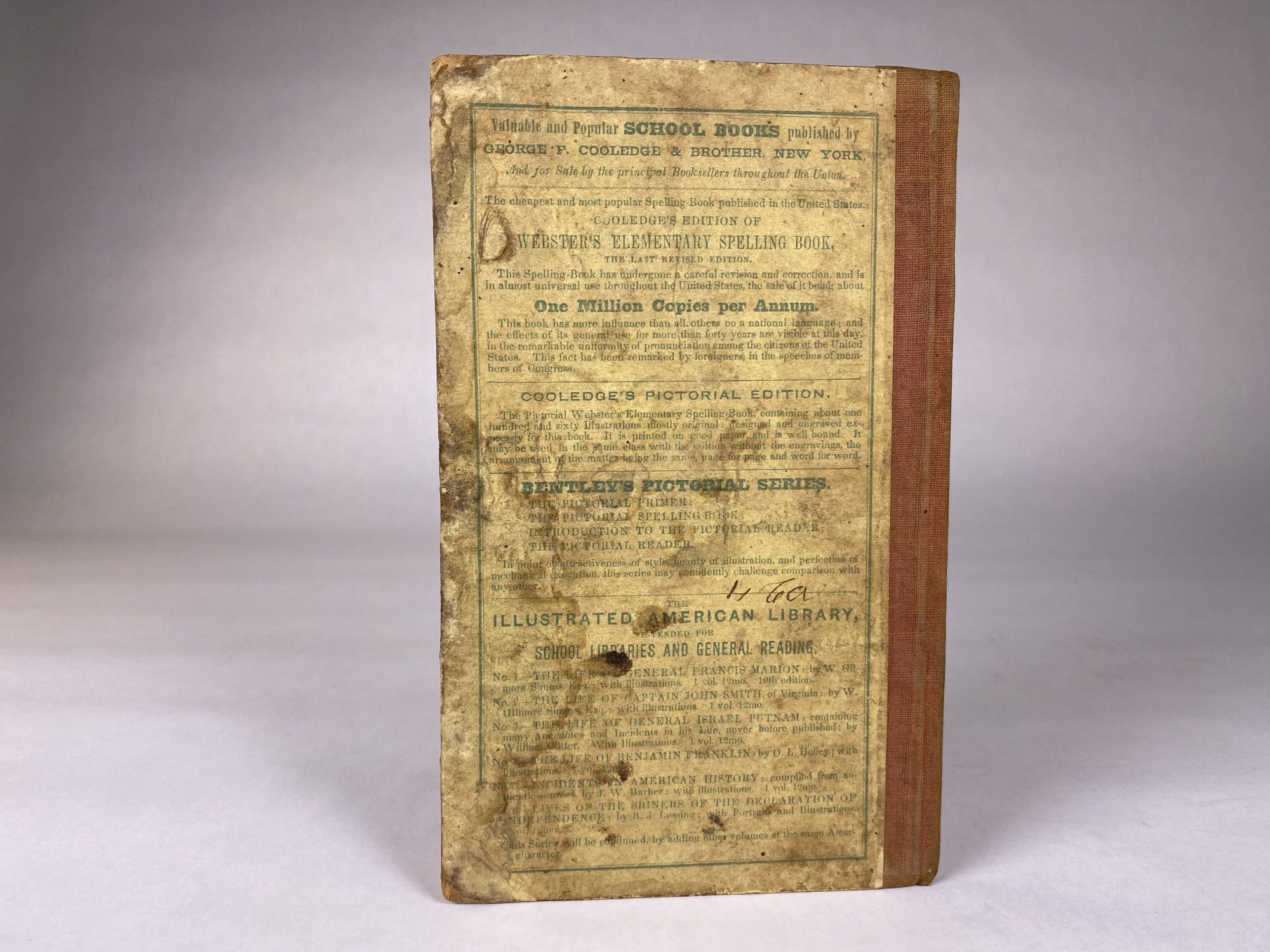 New York: Geo. F. Cooledge & Brother, 1846. Pictorial Boards. Good binding. A mid 19c elementary school primer, with an illustrated alphabet, breakdowns of syllables, morals told in verse, and other usual educational items. The content is suitably Puritan, with 'Disobedience Punished,' and 'Idle Tom' being two sample titles for the reading. The description on OCLC notes that "the same text was also published by George F. Cooledge as The Christmas Primer." Text and wood-engraved illustrations printed in blue, with publisher's advertisements used as endpapers, dating this to 1846. Foxing to the preliminaries. Minor wear to the boards. Quarter brick colored cloth over printed paper boards. 47, [1] pp. Good binding.