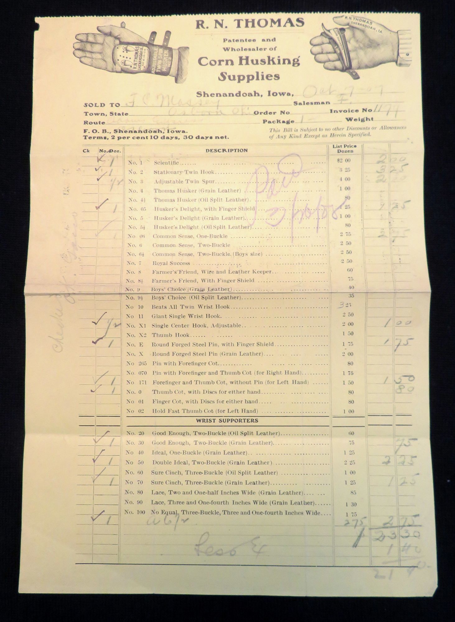 Shenandoah, IA: Corn Husking Supplies, 7-Oct-07. General wear. Letter fold.. A receipt from Corn Husking Supplies in Shenandoah, IA on the company's official billhead. Corn Husking Supplies was owned by R. N. Thomas selling a variety of tools and supplies necessary for corn husking. A large portion of the tools he provided were designed and patented by him. The billhead was printed on carbon paper, and this item is the yellow bottom sheet carbon copy. At the top of the billhead are two wonderfully detailed black and white illustrations. Each is of a hand holding a different tool used in corn husking. The two tools pictured are from R. N. Thomas patented designs: Adjustable Twin Spur Husker No. 3, and Scientific Husker No. 1. The billhead is a preprinted form with blanks for quantity and price. The receipt is for an order bought by F. C. Massey of Osborn, OH, on October 7, 1907, and it was paid for on April 26,1908. Single sheet on yellow carbon paper. Measures 12" x 8 1/4
