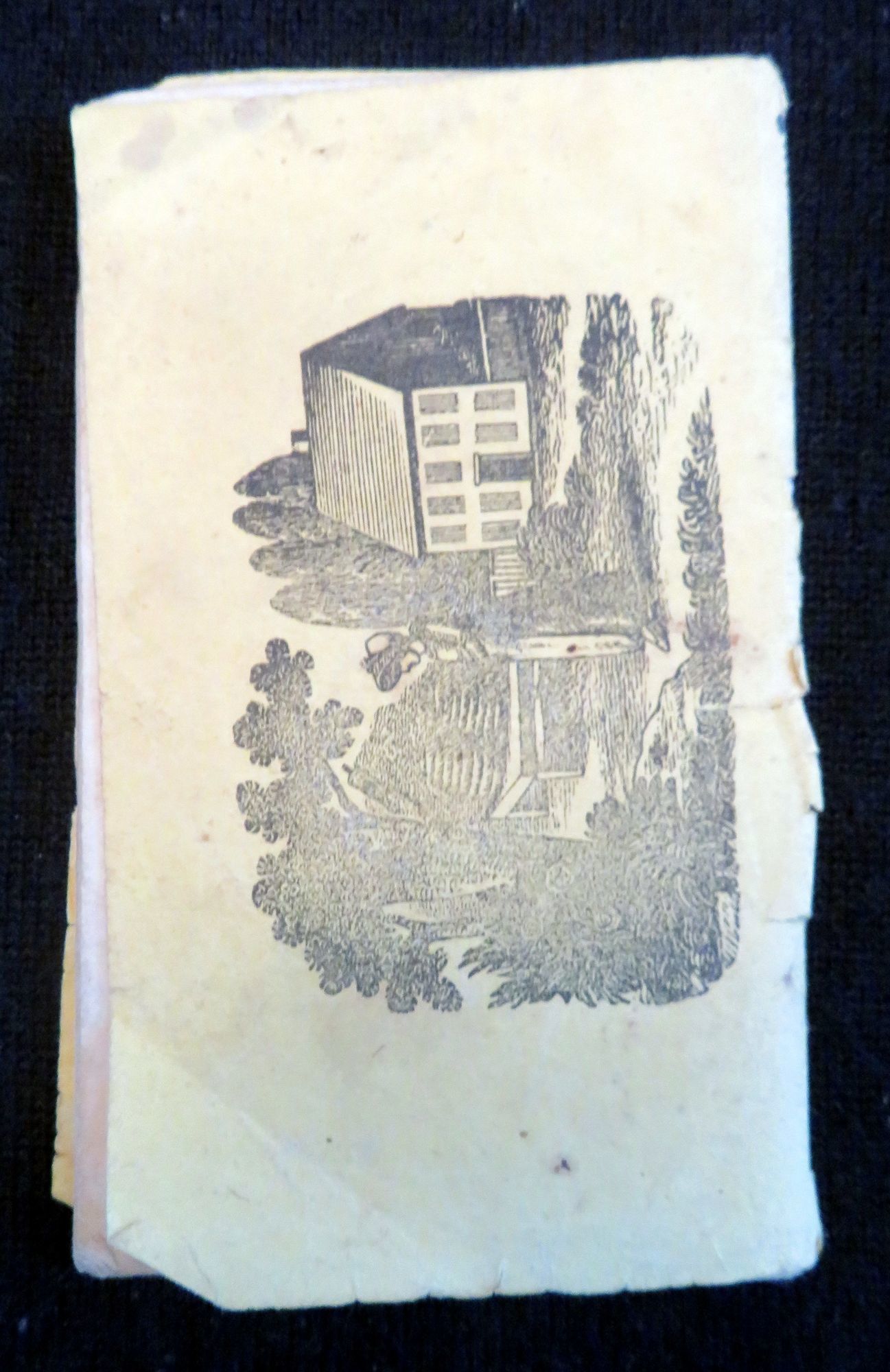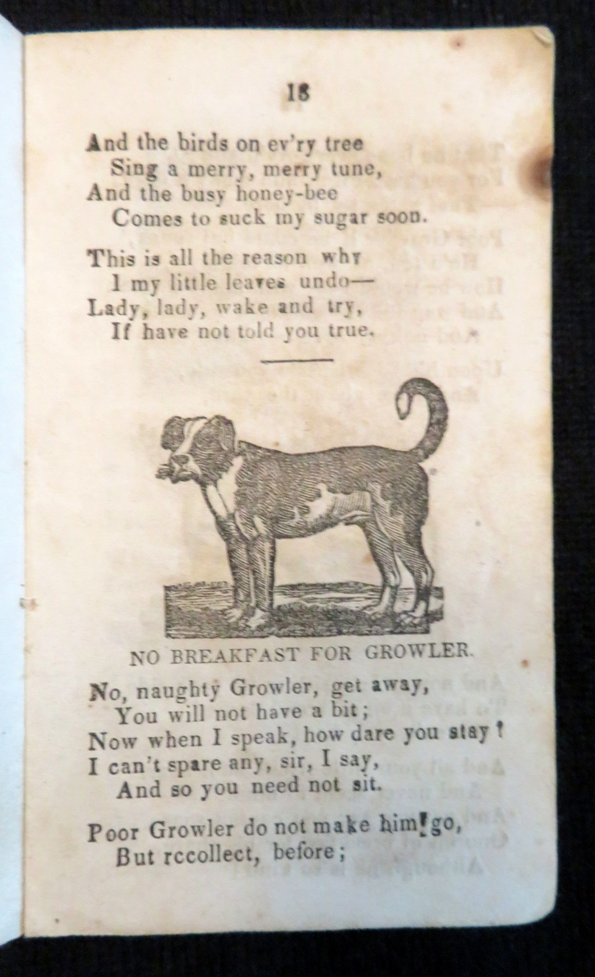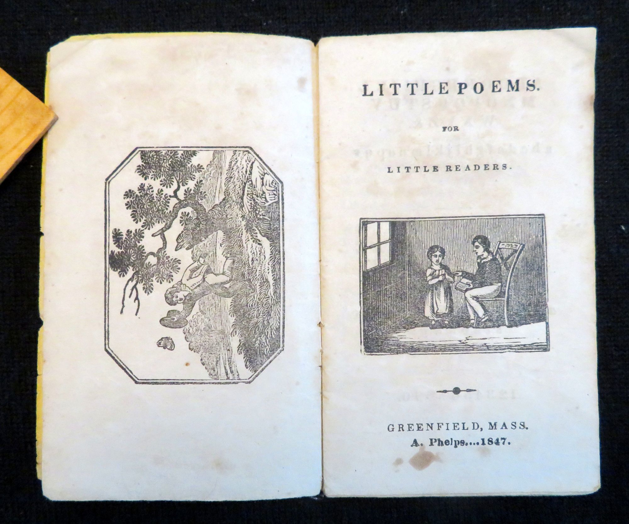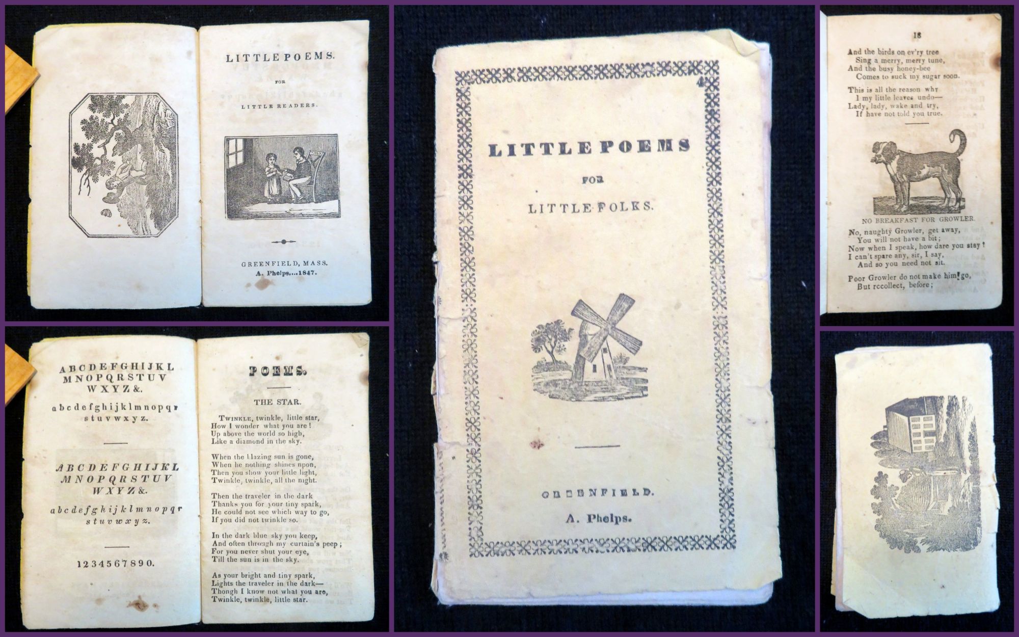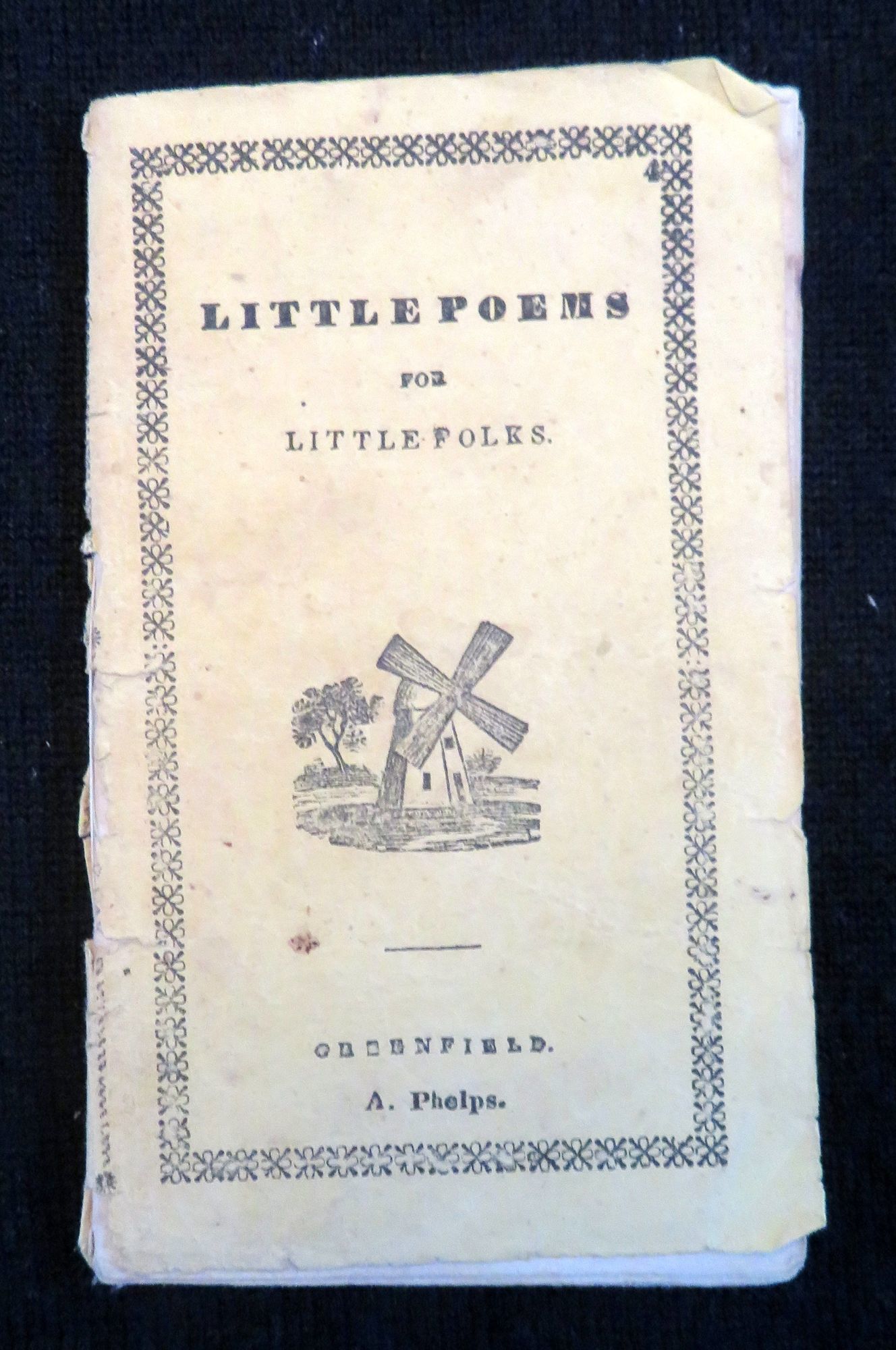 Greenfield, MA: Ansel Phelps, 1847. General wear, toning, and soiling. Covers almost completely detached. There is a small burn mark on the top edge of the chap book on the interior pages, however it is not found on the cover.. A short chap book containing poems on a variety of subjects aimed at children. Right after the title page there is a page with the alphabet printed, both in regular print and italic, with capitals and non capital letters, as well as the numbers 0-9. The chapbook has sixteen different poems within it, entitled: "The Star", "Come And Play in the Garden", "The Sheep", "The Little Beggar Girl", "The Field Daisy", "The Flower", "No Breakfast for Growler". "The Sun", "The Moon", "Employment", "The Frolicsome Kitten", "Going to Bed", "The Little Gentleman", "The Little Husbandman", "Time to Go to Bed", and "Time to Rise". The majority if not all of the poems feature couplet rhyming in them. There are 19 relevant black and white illustration throughout, plus two on the covers. However there are three poems with no corresponding illustrations: "The Star", "Little Beggar Girl" and "Going to Bed". The cover features a decorative border, along with a small black and white engraving of a windmill. The back cover features large black and white illustration of a woman in what appears to be her garden, with her house in the background. 26 numbered pages. Yellow printed wrappers. Thread binding. Inscribed on inside cover. OCLC 2 (July 2020). Measures 4 3/4" x 2 3/4".