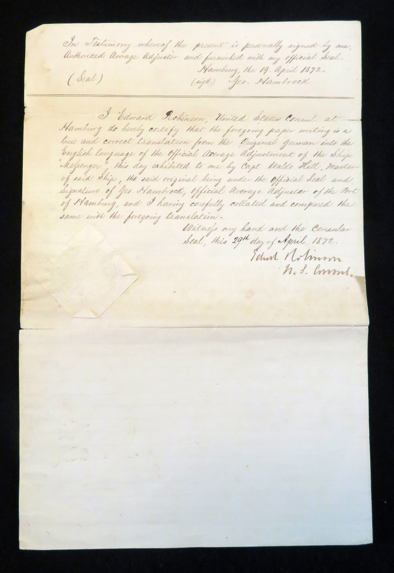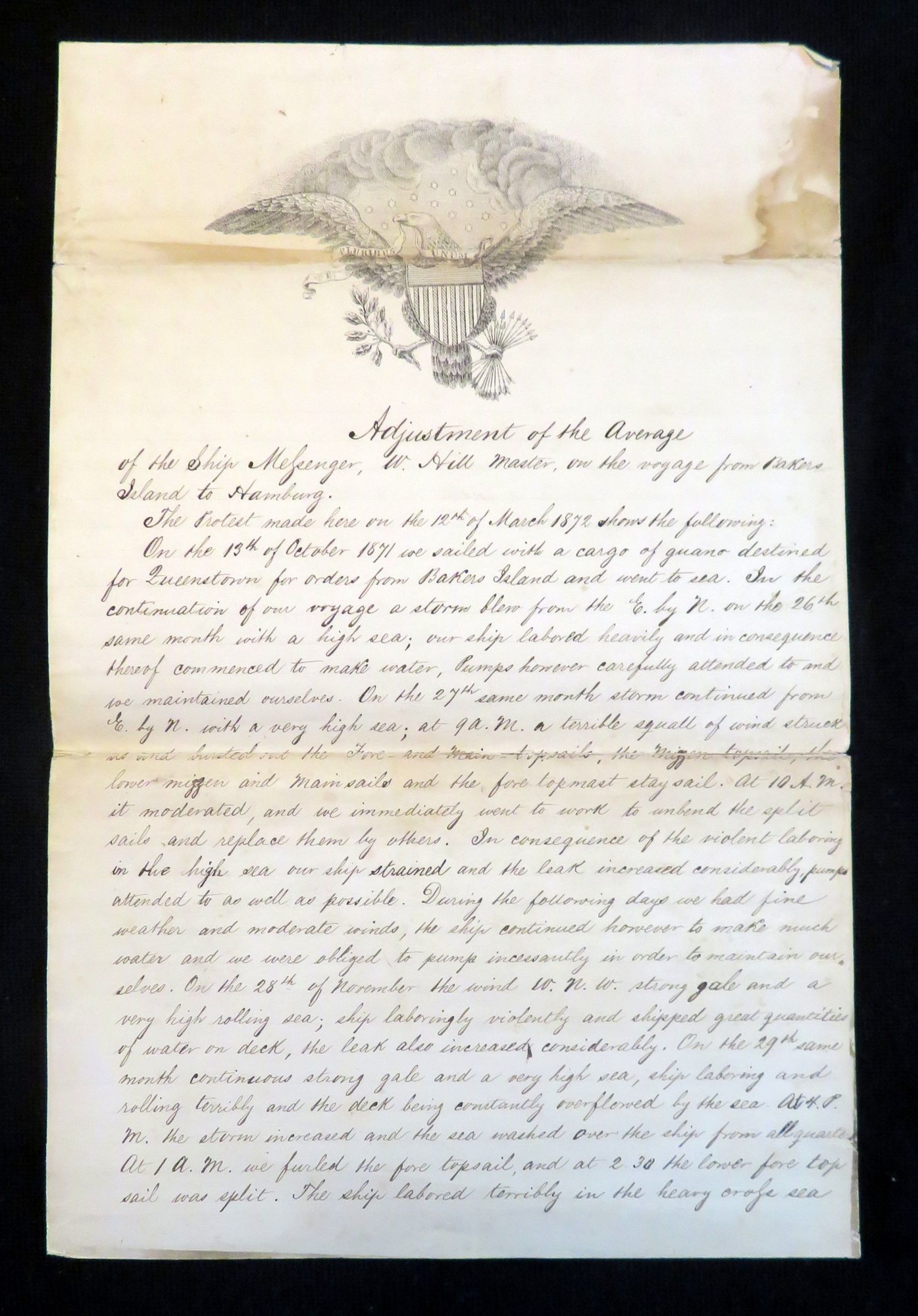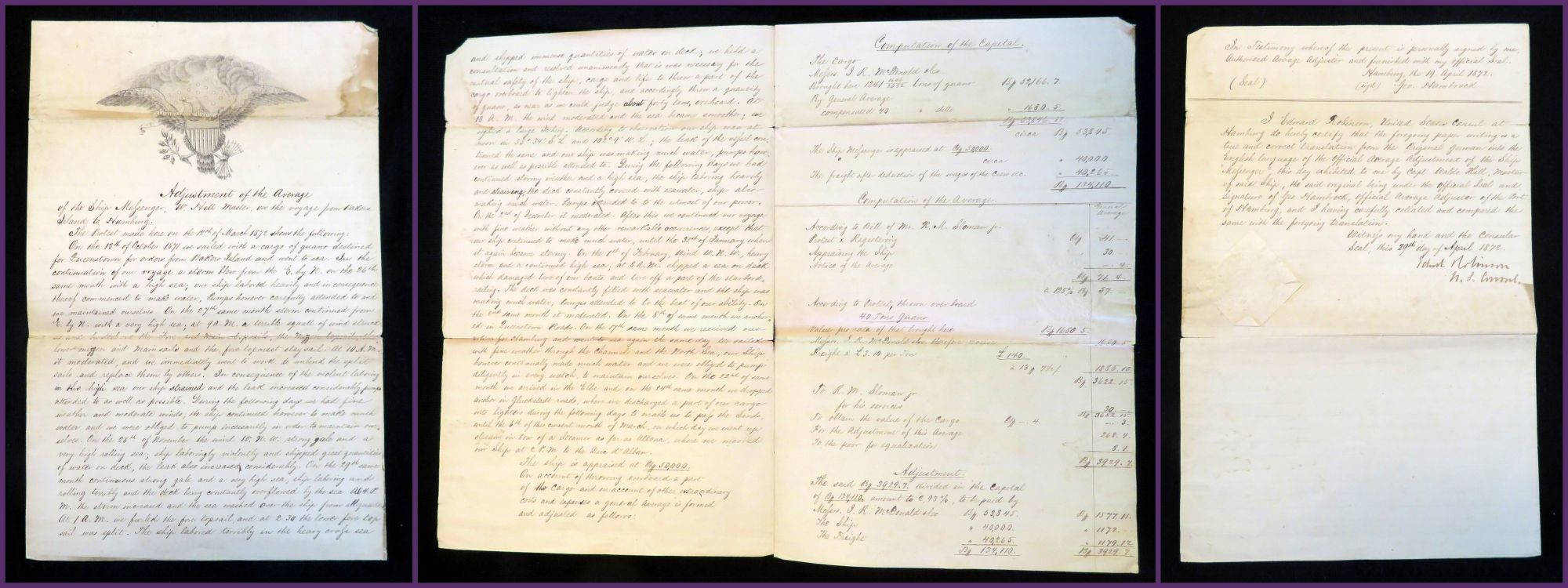 Hamburg, Germany, 1872. General wear. Minor separation at folds. Minor stain on top of page on front.. This document is the English translation of a German document which was the "Adjustment of the Average" for the ship 'The Messenger' which was under Captain Waldo Hill (1814-1888) control and traveled from Bakers Island, MA, to Hamburg, Germany. The trip started on October 12, 1871, with the ship loaded with a cargo of 1241 tons of guano. This was not to be an easy journey, and the Messenger encountered several storms, torn sails and a constant leak in the hull on there journey across the Atlantic Ocean. This leak caused the crew to almost constantly pump excess water out of the ship in order to prevent both damage to the cargo and the ship itself. At one point in order to lessen the load approximately 40 tons of guano was dumped overboard. Eventually the ship made it to its destination, Hamburg, on March 6, 1872, and this document is the official statement of Capt. Hill on the journey over and the calculations of the sale of the cargo , the amount throw over, and repairs need on the ship. This record and calculations were done by George Hambrock, the Official Average Adjuster of the Port of Hamburg in German. The English version of the record was translated and recorded by Edward Robinson, the U. S. Consul to Hamburg from 1869 to 1876. Both his signature and seal are at the end of the document certifying that the English translations matches the original German document. This translation of the statement is written on the letterhead for a United States Consul. It features a rendition of the Great Seal of the United States: the Bald Eagle in the center, with a ribbon in his mouth emblazoned with the text "E Pluribus Unum" (One of many/ One from many), a shield across his breast holding a olive branch and a group of arrows in his claws. This is set on a background of thirteen stars peaking out of clouds in the night sky. As for the dating of this document, it starts with "the protest made on March 12, 1872", however the document was signed by the original adjustor, George Hambrock, on April 19, 1872, and signed by the Consul, Edward Robinson, verifying the translation on April 29th, 1872. Single fold, double sided. Measures 14" x 9" (unfolded), 18" x 14" (unfolded). Captain Waldo Hill was born on August 1, 1814 to James Plaisted Hill II (1773-1816) and Sarah "Sally" Perkins (1768-1856). He had six siblings: Sally Hill (1800-?), Abigail Hill (1802-?), James Plaisted Hill III (1804-1886), Annah Hill (1806-?), Olive Hill (1808-1826), Jotham Hill (1811-?). He married Lorana Hill (1814-1891) in March of 1839 and had five children: Charles Hill (1843-?), Anna M Hill Goodwin Riley (1848-?), Waldo Hill Jr. (1853-1880), Frederic Hill (1856-1900) and Florence L. Hill Roberts (1860-1891). Waldo and his family lived in Biddeford, ME. Waldo was a Sea Captain and Master Mariner, and at least his eldest son, Charles followed in his footsteps, as one the 1870 census his occupation is listed as sailor. Waldo's youngest daughter married Hon. Frank W. Roberts the U.S. Consul to Coaticooke, Canada. He died on at the age of 73 on March 12, 1888.