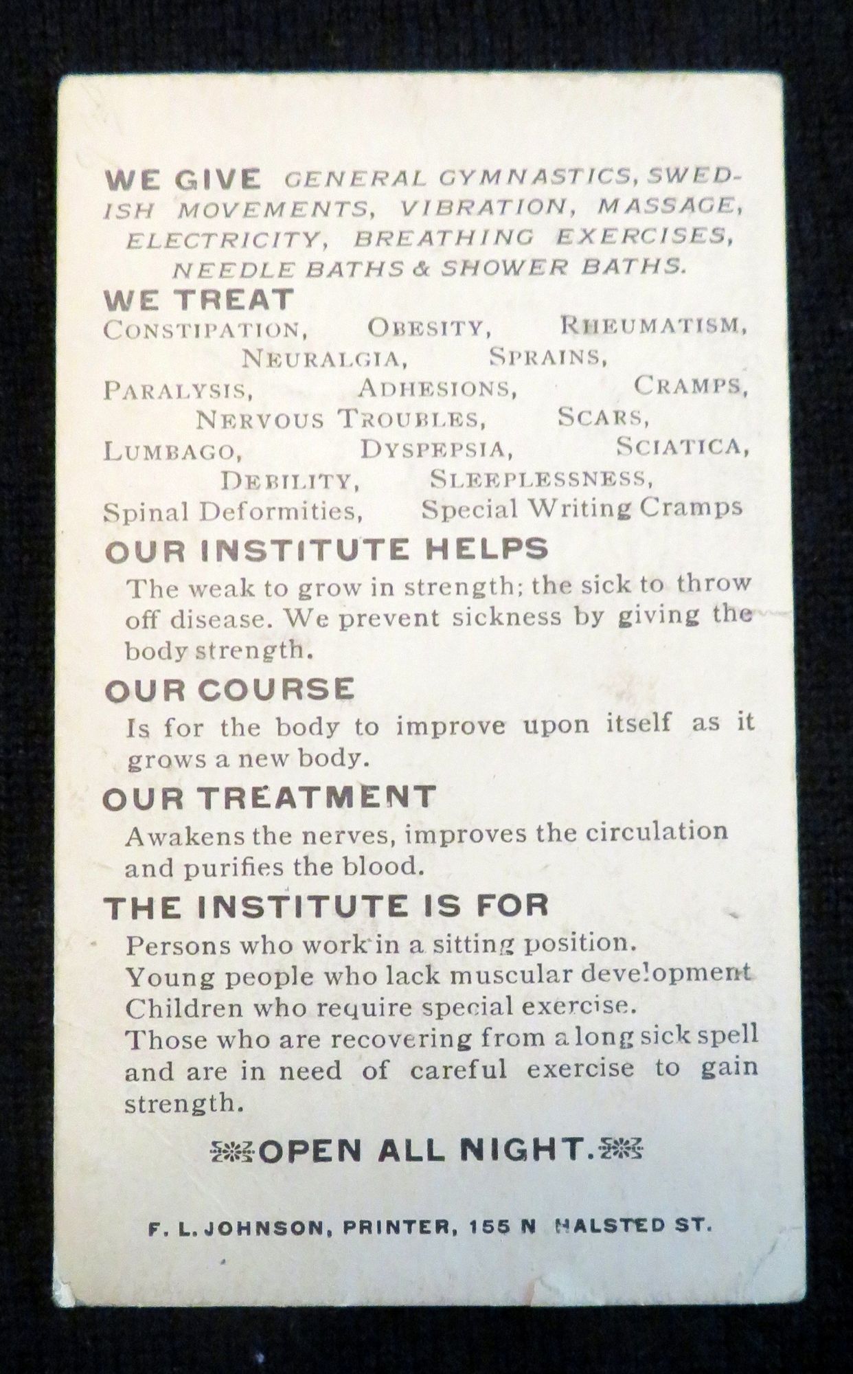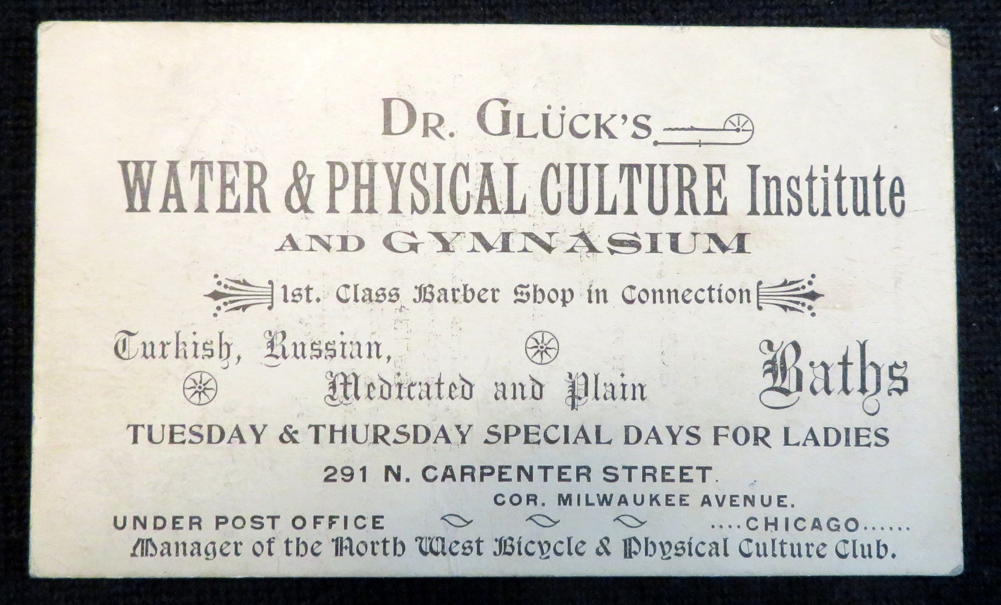 Chicago, IL: Dr. Gluck's Water & Physical Culture Institute and Gymnasium, 1920. General wear and soiling.. A promotional card for Dr. Gluck's Water & Physical Culture Institute and Gymnasium which provided medicated and plain baths to its patrons. Located in Chicago, the institute promoted itself as place that helps "the weak to grow in strength; the sick to throw off disease. We prevent sickness by giving the body strength." It provided a variety of treatments such as Turkish and Russian baths, general gymnastics, Swedish movements, vibration, massage, electricity, breathing exercises, needle baths and shower baths. These treatments supposedly would help to treat: constipation, obesity, rheumatism, neuralgia, sprains, paralysis, adhesions, cramps, nervous troubles, scars, lumbago, dyspepsia, sciatica, debility, sleeplessness, spinal deformities, and special writing cramps. The card also states that the institute is for "persons who work in a sitting position, young people who lack muscular development, children who require special exercise, those who are recovering from a long sick spell and are in need of careful exercise to gain strength." The institute was open all night and even had a barber shop. Double sided card. Measures 4 1/2" x 2 1/2