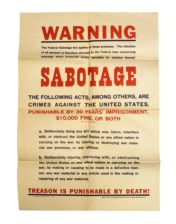 Warning Sabotage Safety War Poster..,."WARNING. The Federal Sabotage Act applies to these premises...Treason is punishable by DEATH