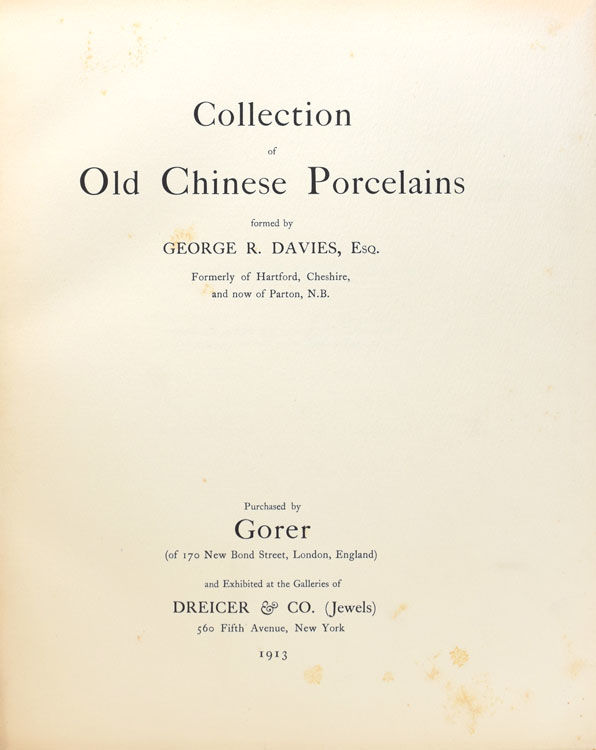 Collection of old Chinese Porcelains formed by George R. Davies, Esq. Formerly of Hartford, Cheshire, and now of Parton. N. B: Purchased by Gorer (of 170 New Bond Street, London) and exhibited at the galleries of Dreicer & Co. (Jewels), New York 1913
