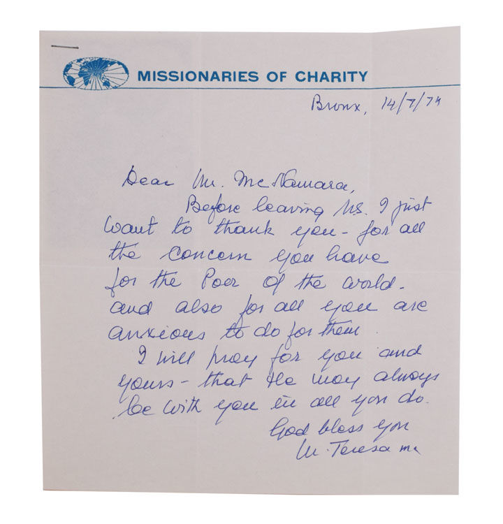 At the time McNamara was serving as the President of the International Bank for Reconstruction and Development. ALs by Mother Teresa are very scarce.