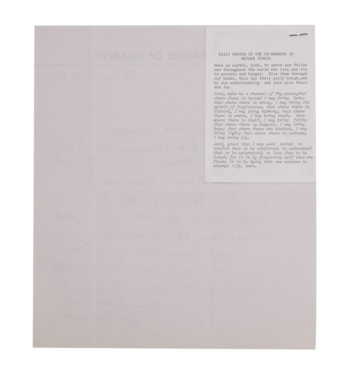 - 1p. on Missionaries of Charity stationery. With a printed Daily Prayer stapled to the upper corner verso