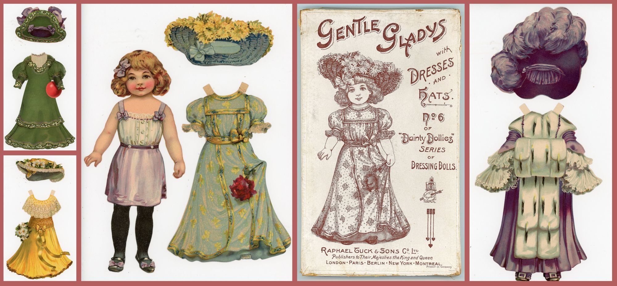 A 9 1/22" x 5 3/4" litho on paste board box depicting Gentle Gladys on the cover. Includes the 9" die-cut Gladys with attached head and easel back and her four (4) costumes and hats. The costumes are designed to tuck beneath the head. Each piece identified on reverse gown/hat ___ for No. 6.