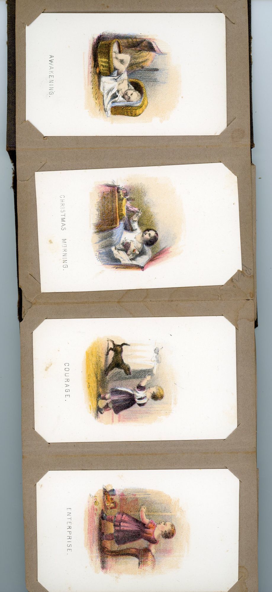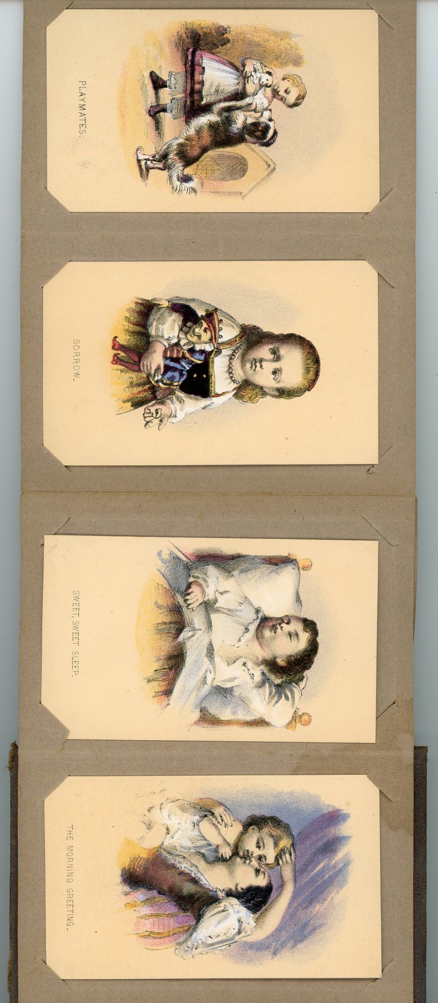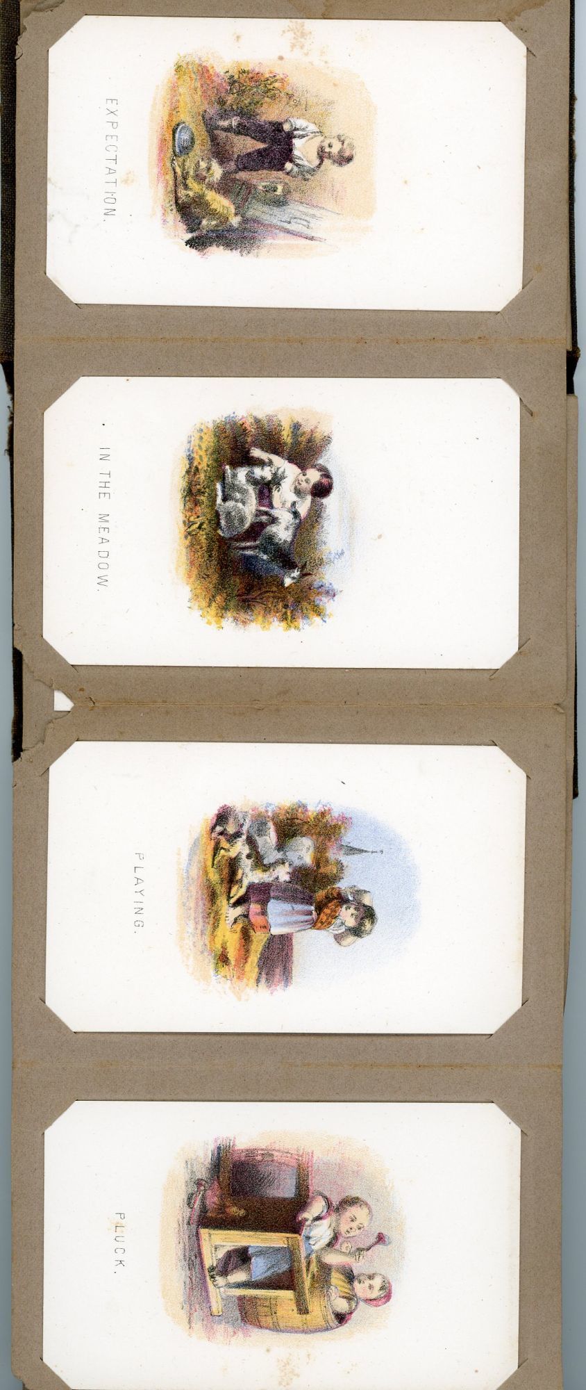 A 5" x 4 4/8" stamped cloth on board album with concertina style pages intended for inserting Louis Prang album cards. This album includes all cards from the Life of Childhood series. Part 1 and Part 2. There are a total of 24 cards, filling all of the slots in the album. Each full color lithograph card depicts an image of a child with a relevant caption. They include Awakening, Christmas Morning, Courage, Enterprise, Expectation, In the Meadow, Playing, Pluck, The First Walk, The Orphan, The Pet, The Pond, Brother & Sister, Caught in a Shower, Crossing the Brook, Early Vanity,Into the Honey Pot, Joy, Mother Darling, Mother's Joy, Playmates, Sorrow, Sweet Sweet Sleep and The Morning Greeting. Also included is the wrapper for the Part 2 Life of Childhood card series. Note the first 12 cards have a white background, with the remaining 12 a creme colored background. Most likely the difference between Part 1 and Part 2. 2 3/4" x 4 3/4". Cards 4" x 2 1/2". OCLC- 1 for Part 1 of Life of Childhood only (Nov 2020), Each set included a series of 12.