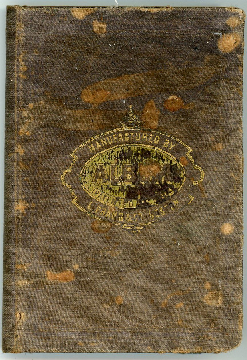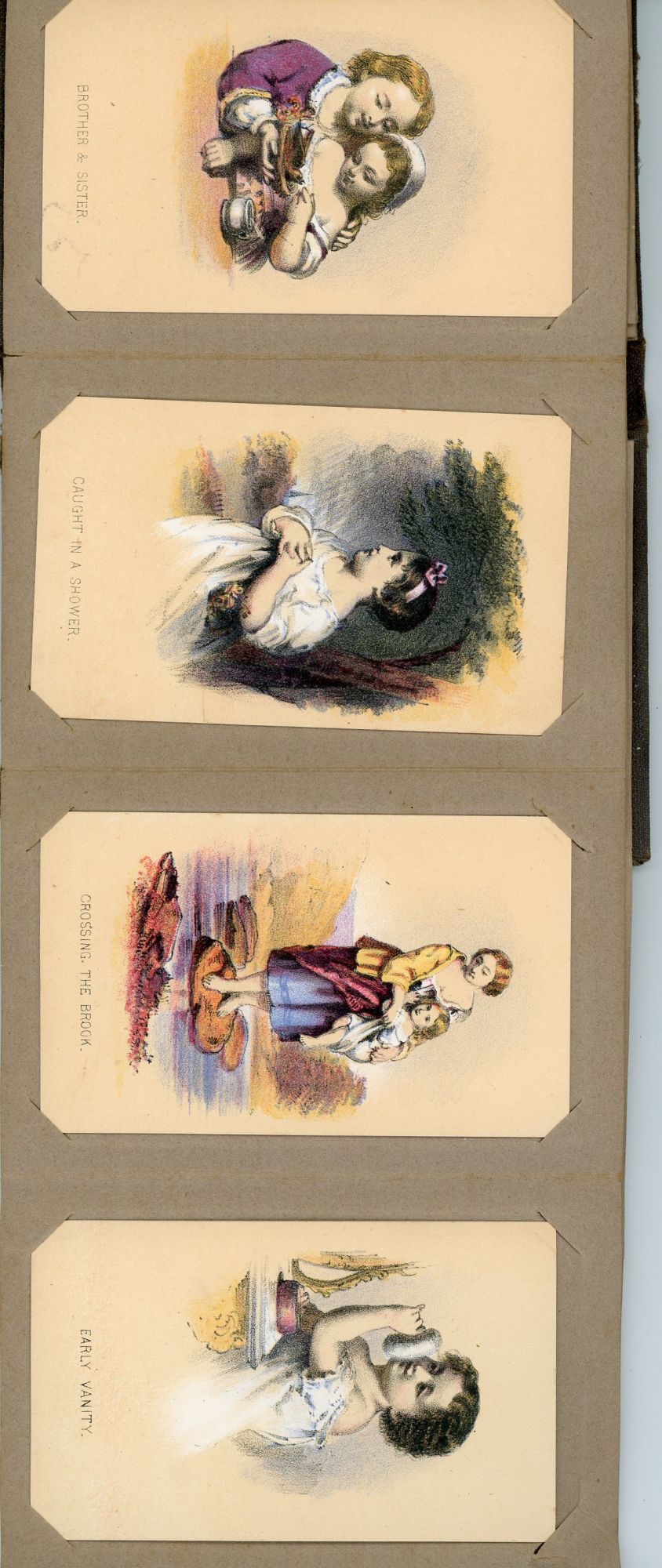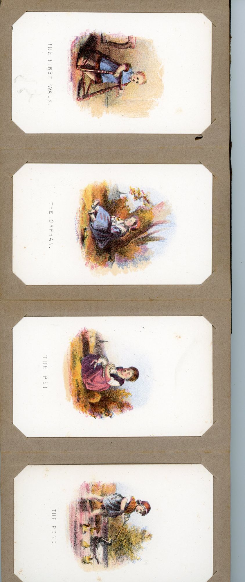 A 5" x 4 4/8" stamped cloth on board album with concertina style pages intended for inserting Louis Prang album cards. This album includes all cards from the Life of Childhood series. Part 1 and Part 2. There are a total of 24 cards, filling all of the slots in the album. Each full color lithograph card depicts an image of a child with a relevant caption. They include Awakening, Christmas Morning, Courage, Enterprise, Expectation, In the Meadow, Playing, Pluck, The First Walk, The Orphan, The Pet, The Pond, Brother & Sister, Caught in a Shower, Crossing the Brook, Early Vanity,Into the Honey Pot, Joy, Mother Darling, Mother's Joy, Playmates, Sorrow, Sweet Sweet Sleep and The Morning Greeting. Also included is the wrapper for the Part 2 Life of Childhood card series. Note the first 12 cards have a white background, with the remaining 12 a creme colored background. Most likely the difference between Part 1 and Part 2. 2 3/4" x 4 3/4". Cards 4" x 2 1/2". OCLC- 1 for Part 1 of Life of Childhood only (Nov 2020), Each set included a series of 12.