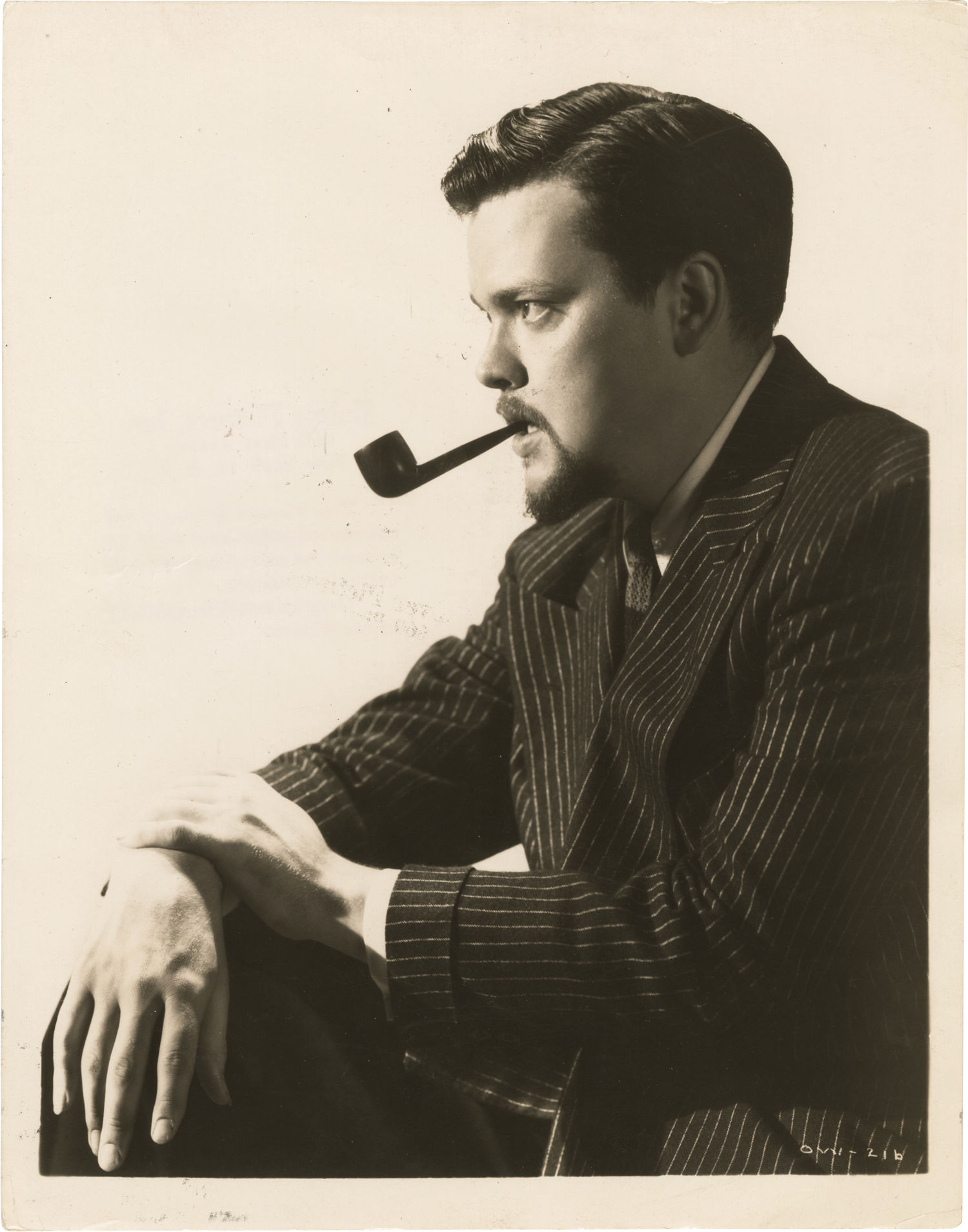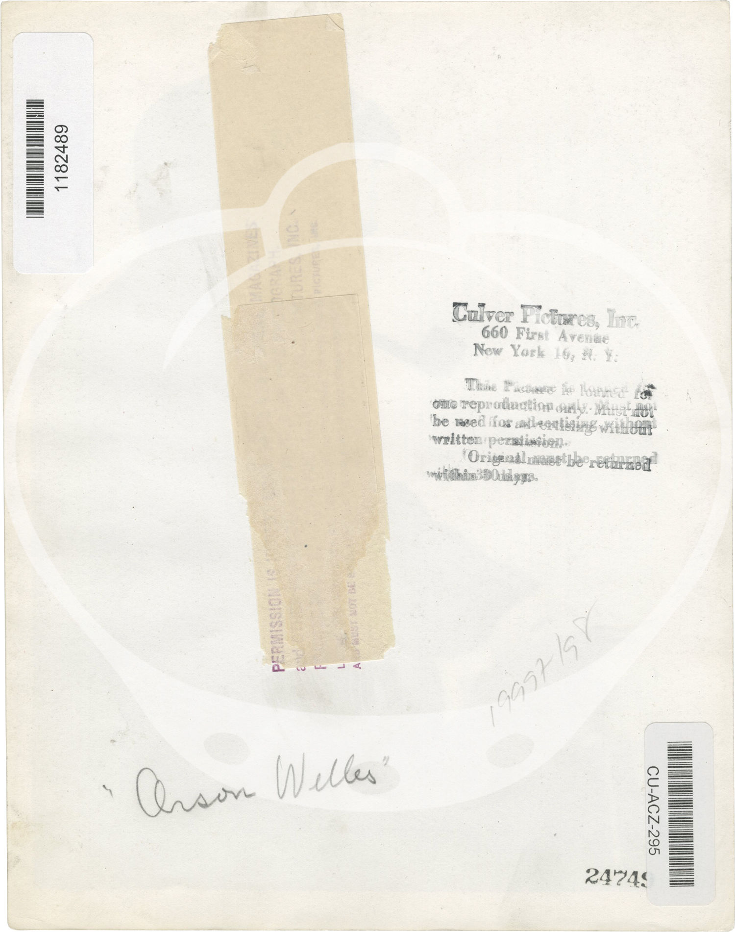N.p.: N.p., 1939. Vintage portrait photograph of a young Orson Wells, circa 1939. "Culver Pictures, Inc." stamp, "24749" stamp, and two other stamps obscured by paper tape, on verso.