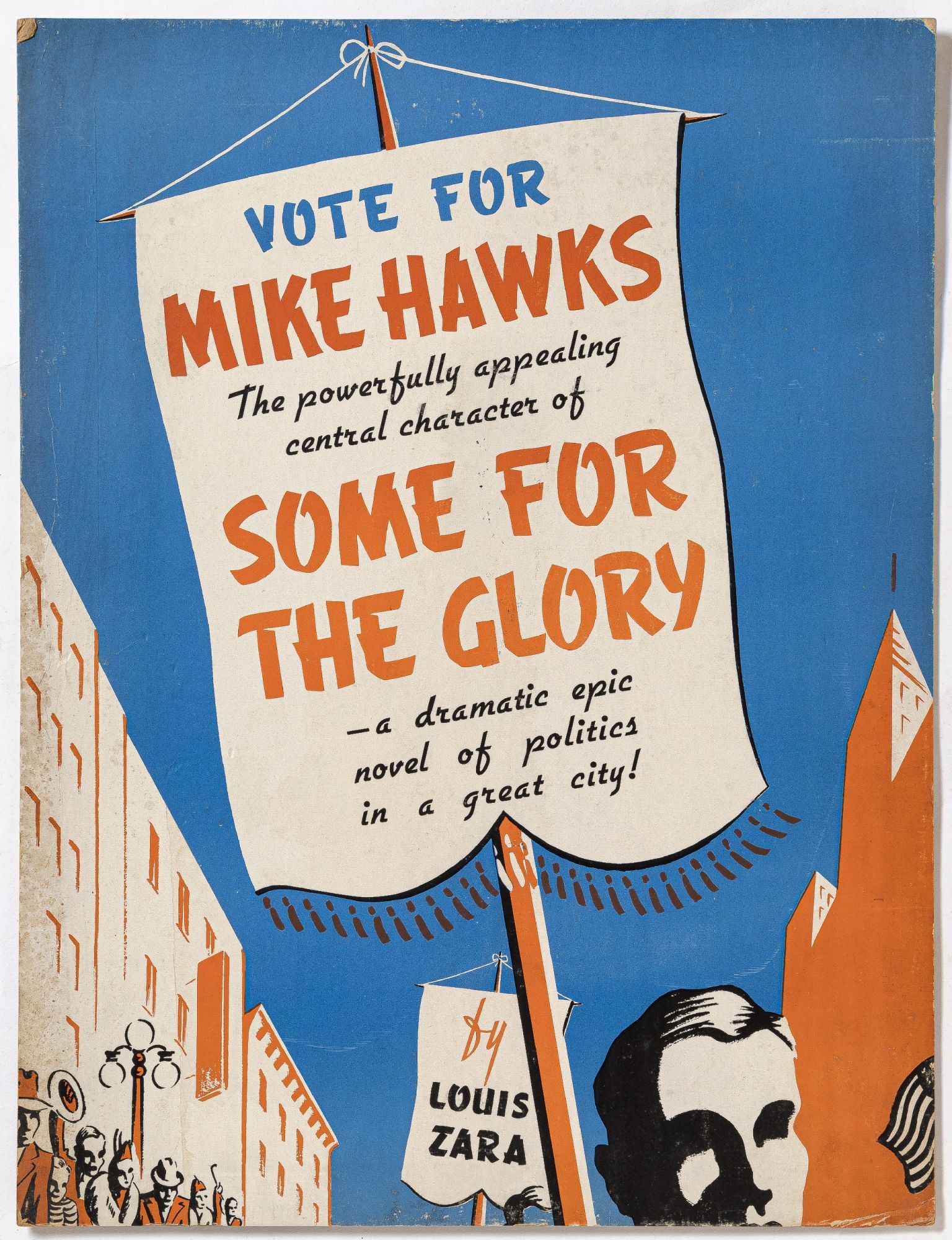 [Bobbs-Merrill], 1937. Softcover. Very Good. Broadside poster. Measuring 15" x 20". Slight soiling, worn edges, and rubbing thus very good. A promotional poster for the Louis Zara historical novel, *Some for the Glory*. It featured a man holding a sign which reads, "Vote for Mike Hawks the powerfully appealing central character of Some for the Glory - a dramatic epic novel of politics in a great city!
