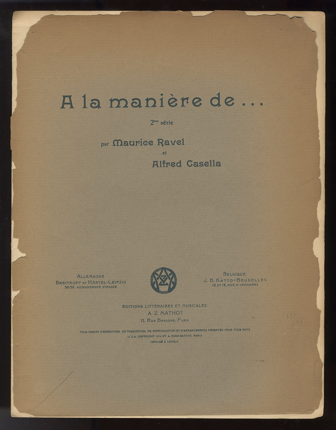 Paris: A.Z. Mathot [PN Z. 729[-732] M.], 1914. Folio (355 x 270 mm). Original publisher's green wrappers with titling printed in dark green. [1] (title), [2]-15, [i] (publisher's advertisement) pp.