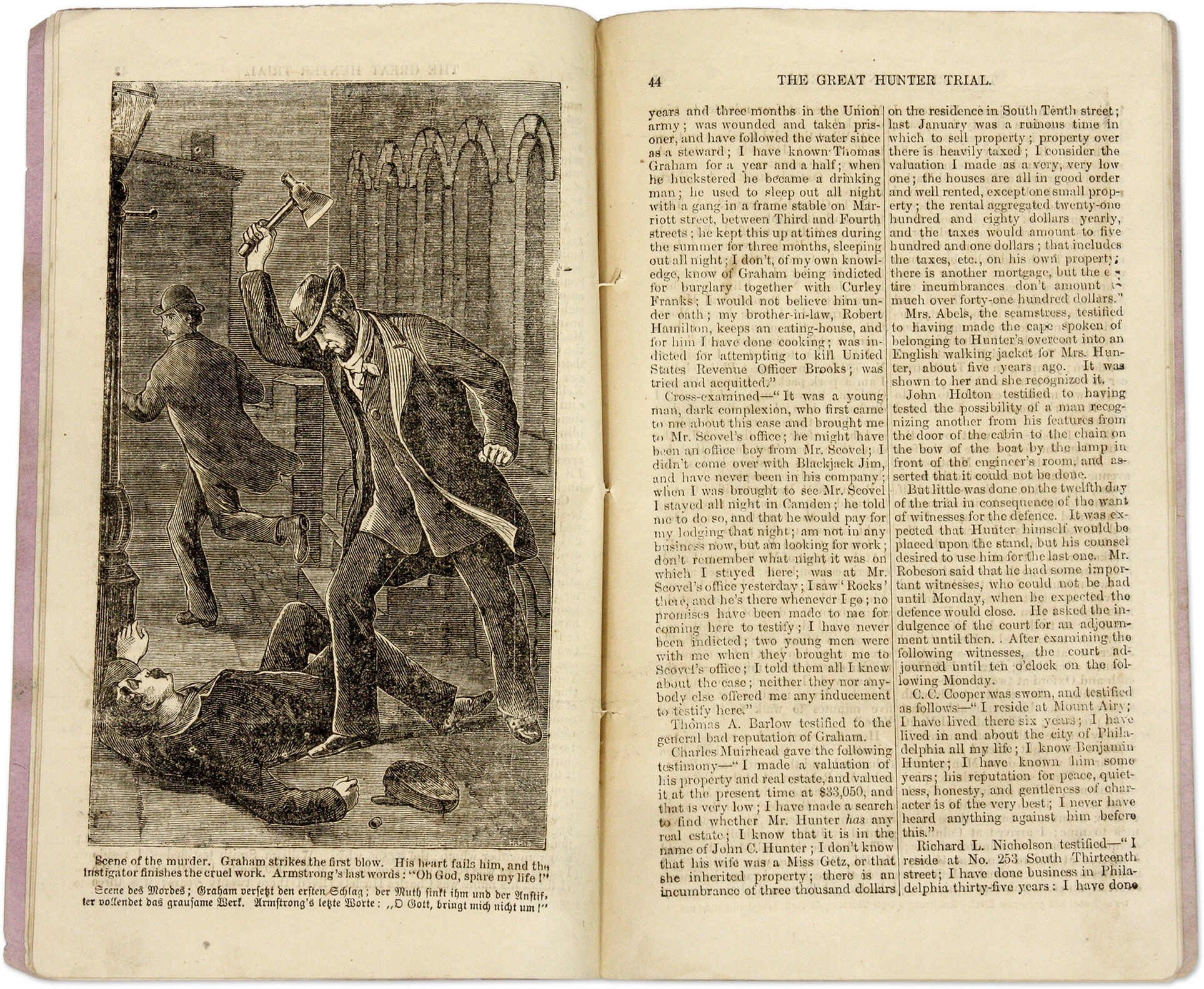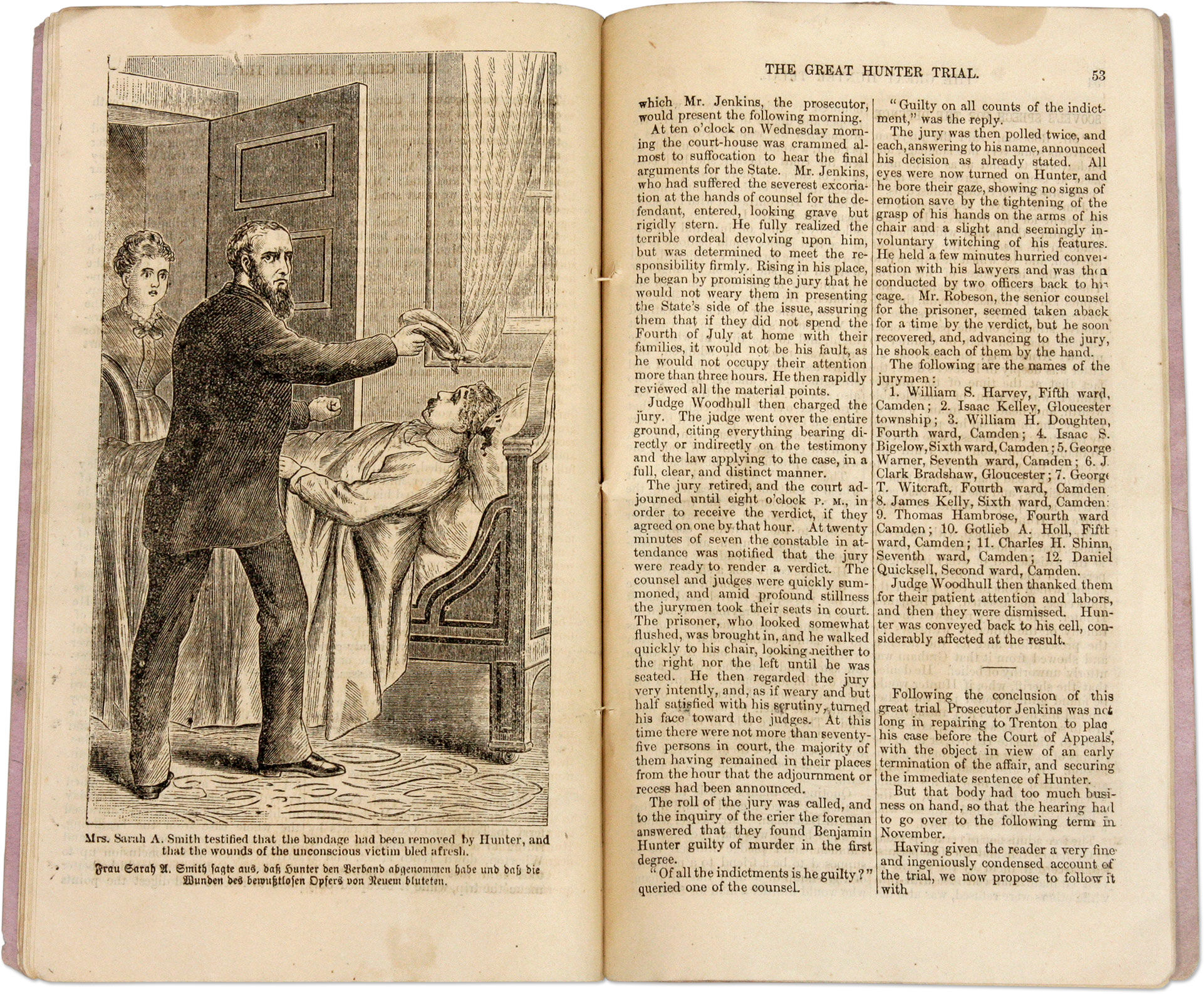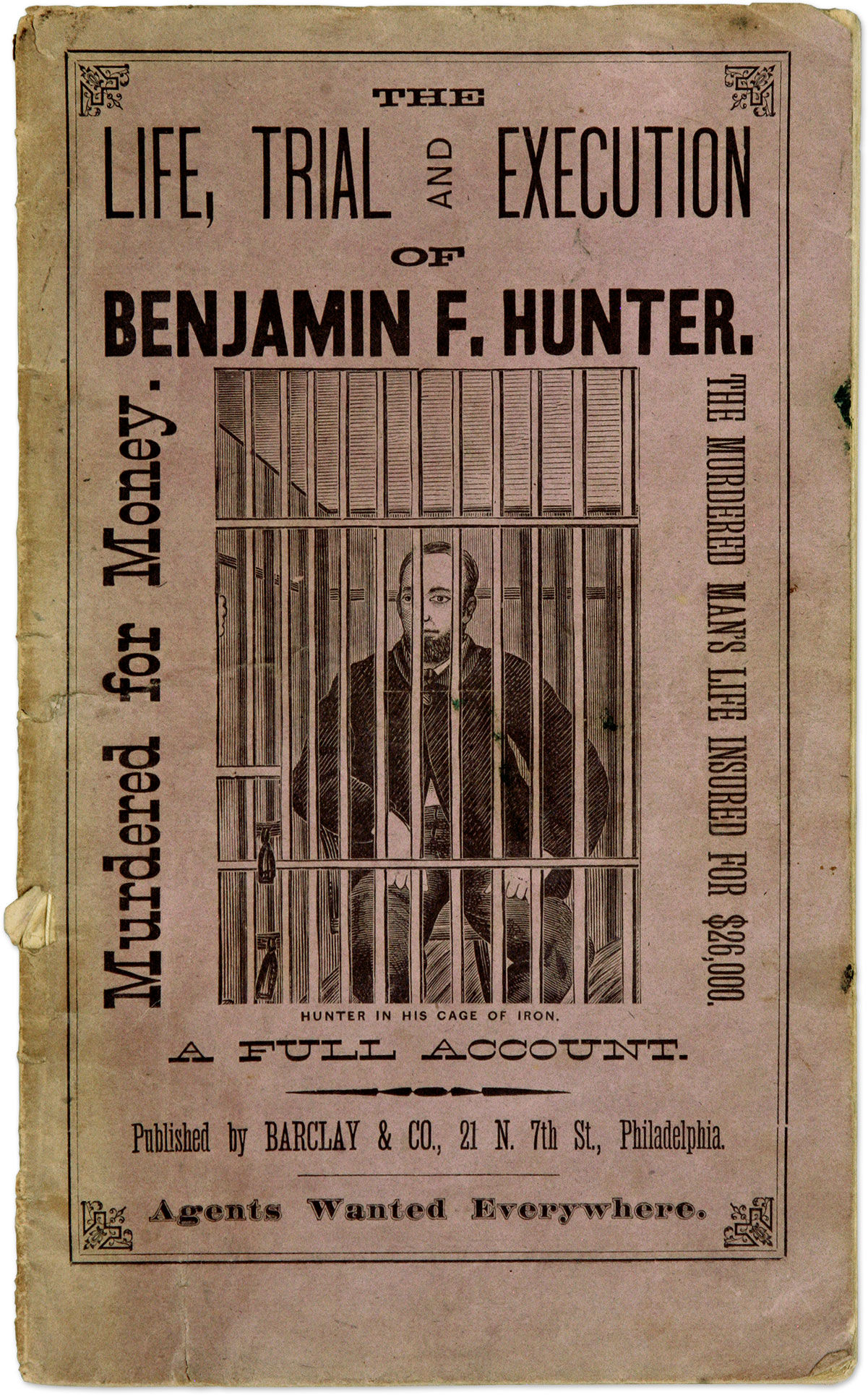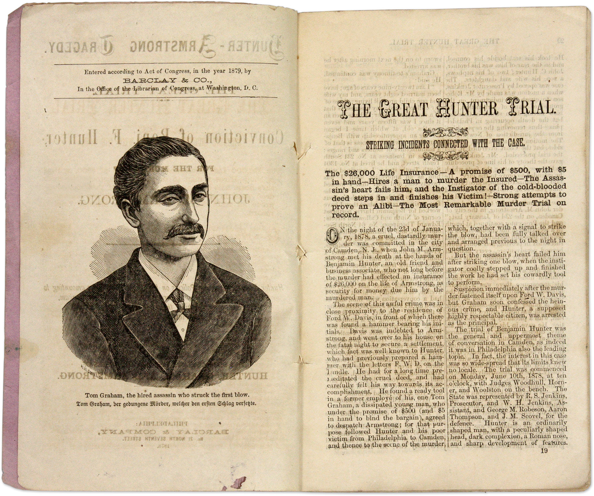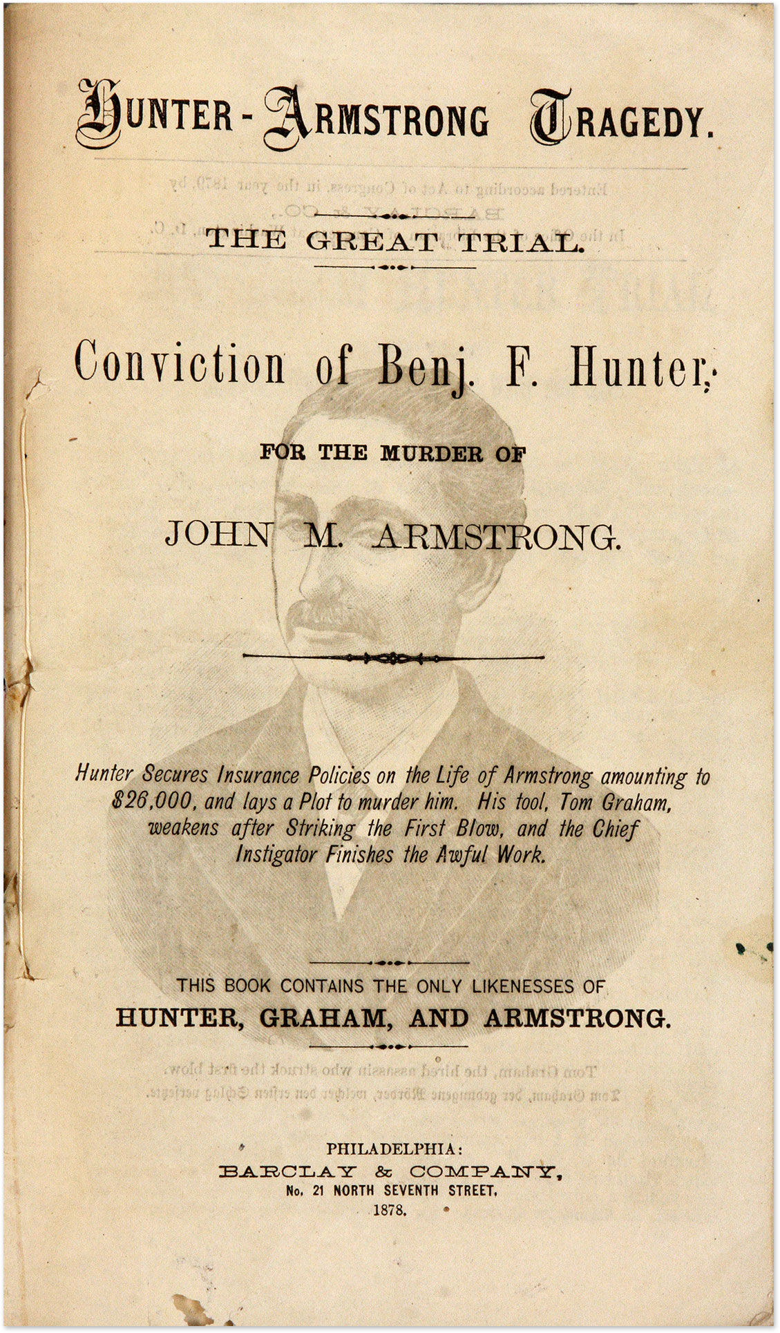1878. Philadelphia: Barclay & Co., 1878.. Philadelphia: Barclay & Co., 1878. An Axe-Murder in Camden, NJ: McDade 494 [Trial]. Hunter, Benjamin F. [d. 1879], Defendant. Hunter-Armstrong Tragedy. The Great Trial. Conviction of Benj. F. Hunter, For the Murder of John M. Armstrong. Philadelphia: Barclay & Company, 1878. [ii], 19-86 pp. Main text in parallel columns. 7 full-page woodcuts. Octavo (9-1/2" x 5-3/4"; 24.1 x 14.6 cm). Stab-stitched pamphlet in pictorial wrappers, cover title reads, in part: The Life, Trial and Execution of Benjamin F. Hunter. Light soiling, moderate edgewear and a few chips and tears to edges of wrappers, which are beginning to detach at foot of spine. Moderate toning to text, faint dampstaining to a few leaves. $750. * First edition, one of five issues. "Hunter had lost $7,000 when he invested in Armstrong's music-publishing company. Thinking to turn his loss into a profit, he insured Armstrong's life for $25,000. With a hired assistant, Tom Graham, he enticed Armstrong to Camden, New Jersey, and there bashed his head in with an axe which he had carefully marked with the initials of another man to throw suspicion on him. Though he remained unconscious, Armstrong survived, and Hunter, calling at his home, hastened his death by tearing the bandages from his head. Graham confessed and Hunter was convicted and hanged, and he was actually hanged by hand" (McDade). Other issues of this pamphlet have different cover titles and paginations. All are scarce. OCLC locates 7 copies of our 86-page issue, 1 in a law library (University of Missouri). McDade, The Annals of Murder 494.