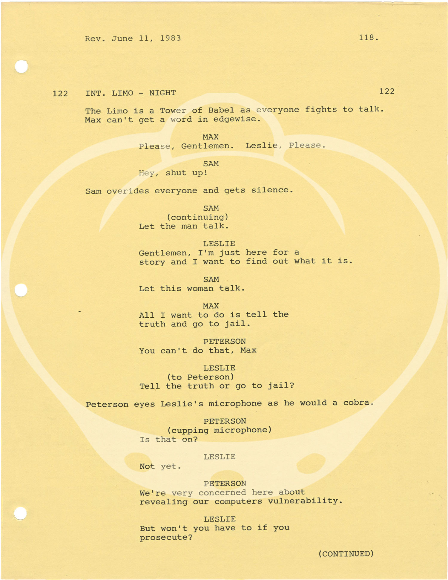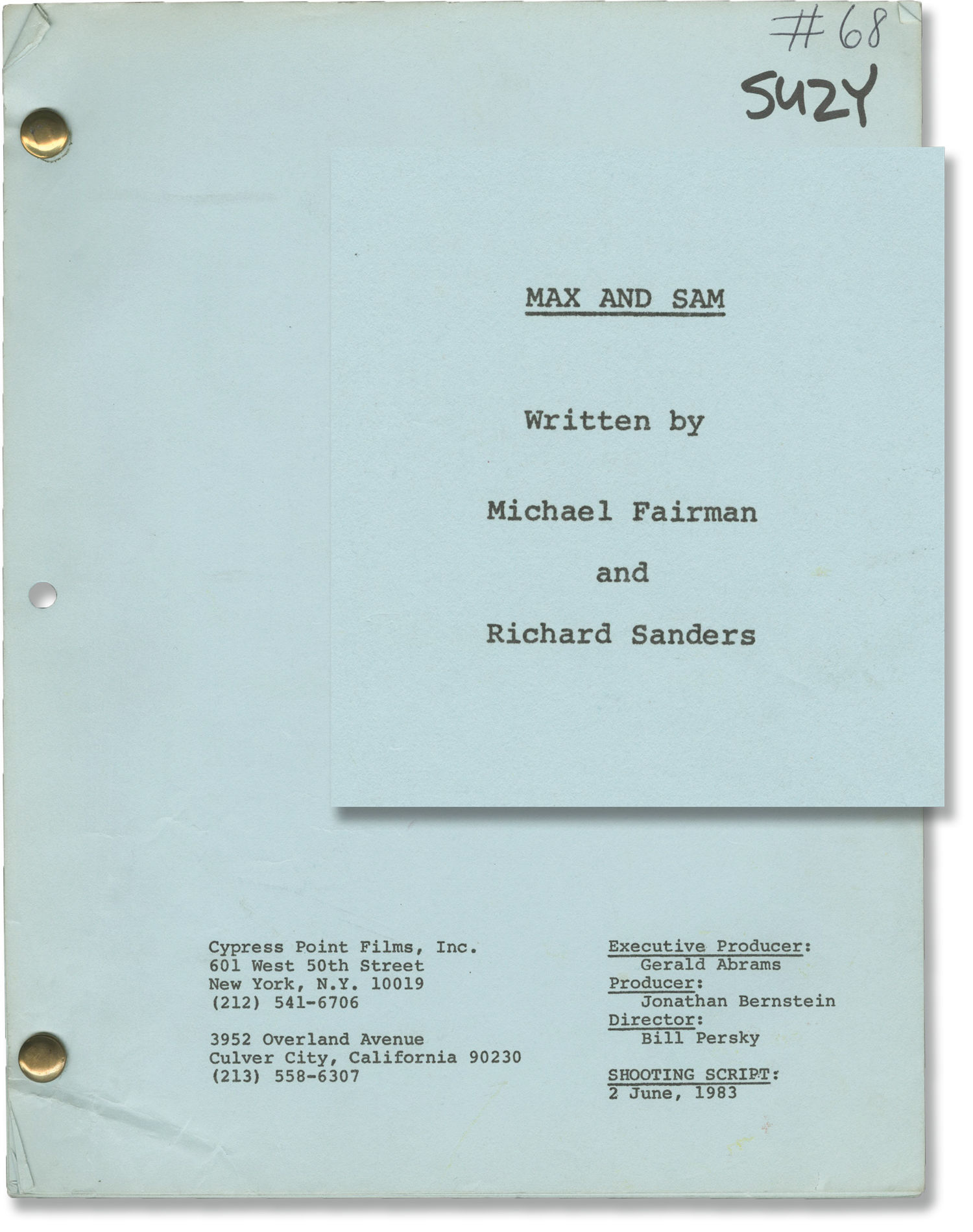 Self wrappers. Title page integral with front wrapper, dated 2 June, 1983, noted as SHOOTING SCRIPT, with credits for screenwriters Michael Fairman and Richard Sanders. 127 leaves, with last page of text numbered 124. Xerographic duplication on blue stock, rectos only, with yellow revision pages throughout, dated June 11, 1983. Pages Very Good plus, with a small tear to the final leaf's fore-edge, bound with two gold brads.
