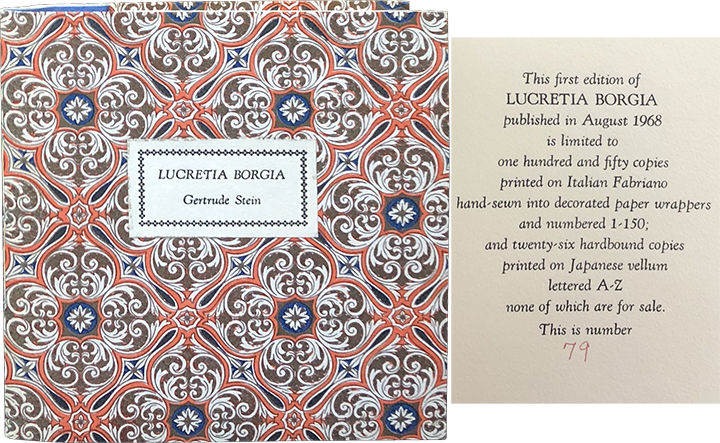 New York: Albondocani Press, 1968. First Edition. Paperback. Fine. Limited to 150 copies. Fine. Patterned paper over plain blue wraps. Square and firmly bound, clean internally. The first edition of the play to faithfully produce Stein's original manuscript.