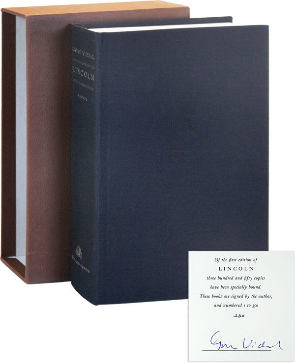 New York: Random House, 1984. First Edition. Limited Issue, one of 350 numbered copies specially bound and signed by the author, this being copy no.230. Octavo (24.25cm); black cloth, with titles stamped in gilt on spine and silhouette of Lincoln embossed on front cover; publisher's original paper-covered slipcase, [viii],657,[7]pp. Fine in a Fine slipcase, with some gentle sunning at upper edge. Historical novel centered around Lincoln's political and personal struggles.
