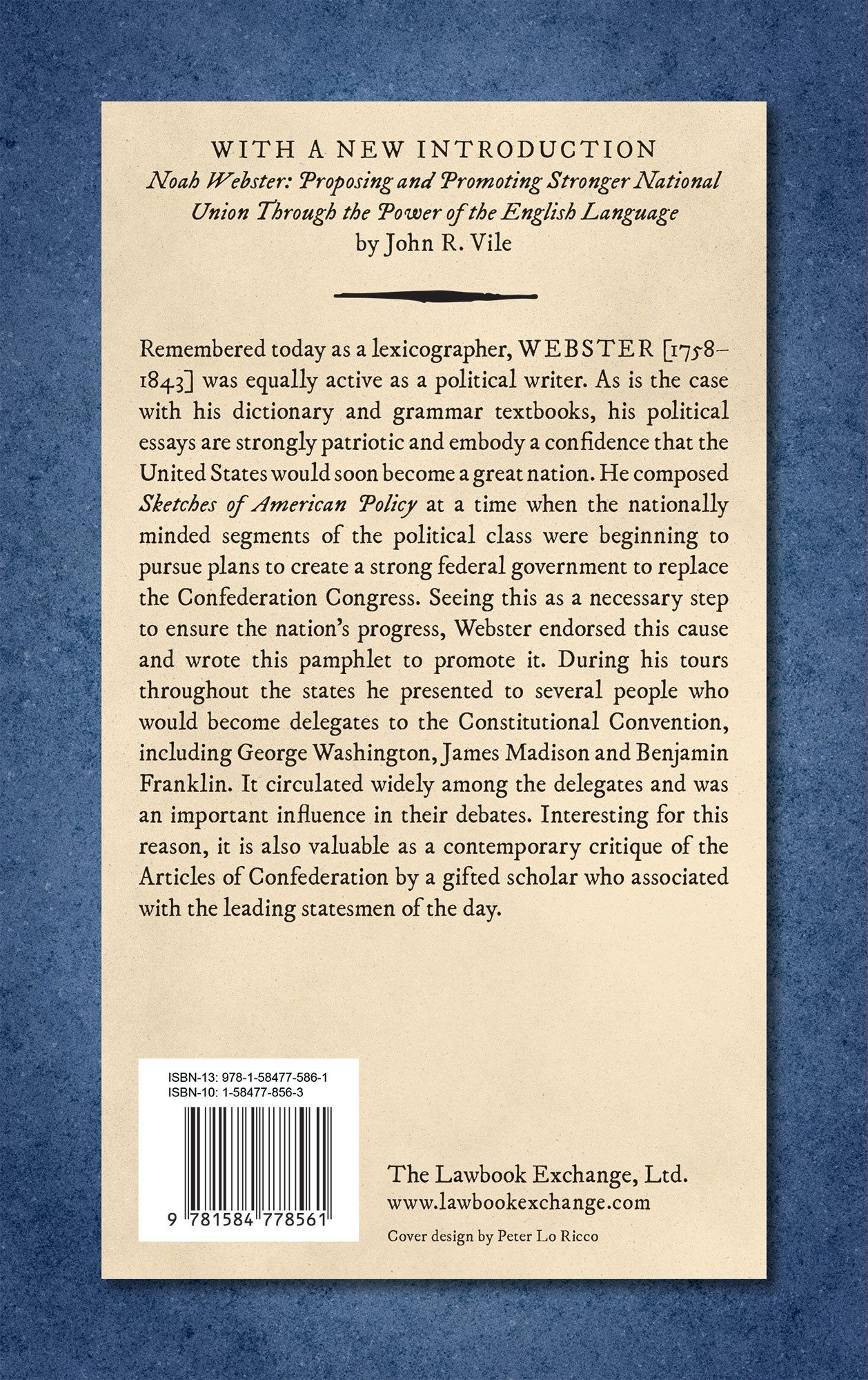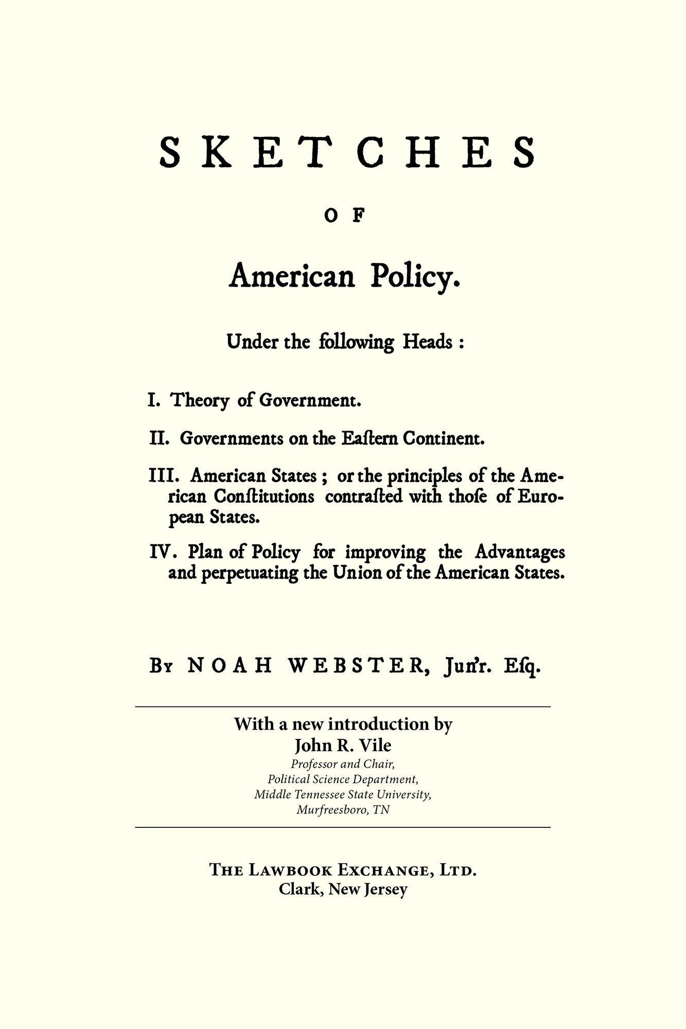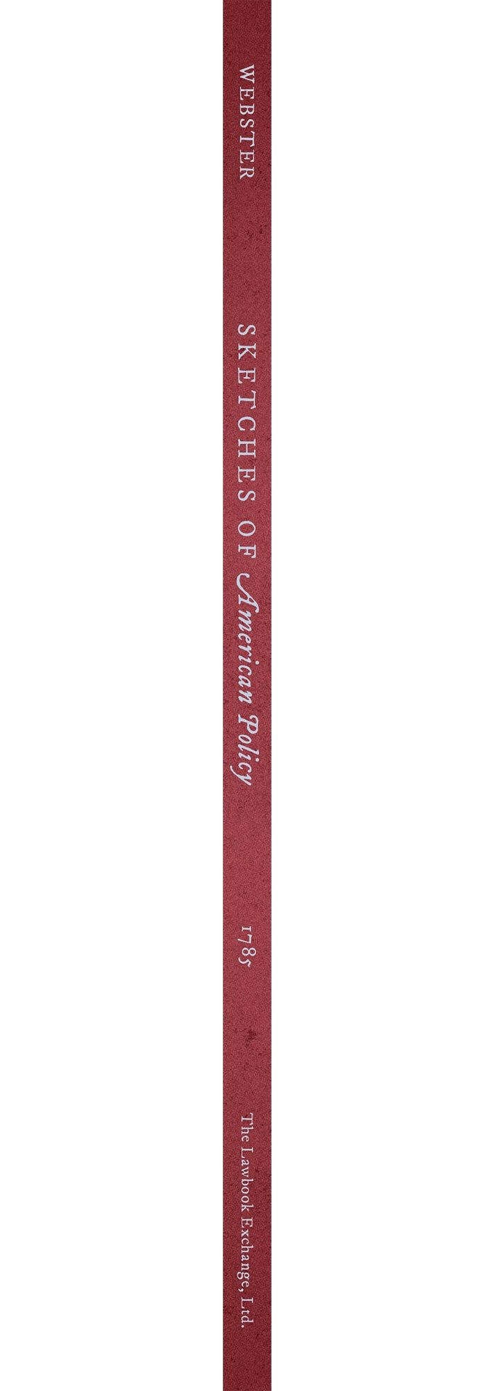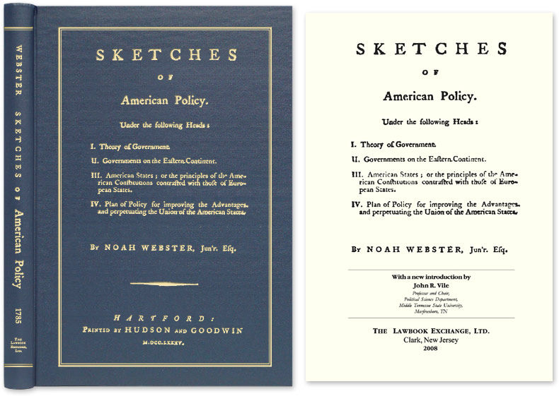 2008. ISBN-13: 9781584778561; ISBN-10: 1584778563. Webster, Noah. Sketches of American Policy. Under the Following Heads: I. Theory of Government. II. Governments on the Eastern Continent. III. American States; Or the Principles of the American Constitutions Contrasted with Those of European States. IV. Plan of Policy for Improving the Advantages and Perpetuating the Union of the American States. Hartford: Printed by Hudson and Goodwin, 1785. xix, 48 pp. With a New introduction with notes ("Noah Webster: Proposing and Promoting Stronger National Union Through the Power of the English Language") by John R. Vile, Professor and Chair, Political Science Department, Middle Tennessee State University, Murfreesboro, TN. Reprinted 2008 by The Lawbook Exchange, Ltd. ISBN-13: 9781584778561; ISBN-10: 1584778563. Hardcover. New. $39.95 * Remembered today as a lexicographer, Webster [1758-1843] was equally active as a political writer. As is the case with his dictionary and grammar textbooks, his political essays are strongly patriotic and embody a confidence that the United States would soon become a great nation. He composed Sketches of American Policy at a time when the nationally minded segments of the political class were beginning to pursue plans to create a strong federal government to replace the Confederation Congress. Seeing this as a necessary step to ensure the nation's progress, Webster endorsed this cause and wrote this pamphlet to promote it. During his tours throughout the states he presented to several people who would become delegates to the Constitutional Convention, including George Washington, James Madison and Benjamin Franklin. It circulated widely among the delegates and was an important influence in their debates. Interesting for this reason, it is also valuable as a contemporary critique of the Articles of Confederation by a gifted scholar who associated with the leading statesmen of the day.