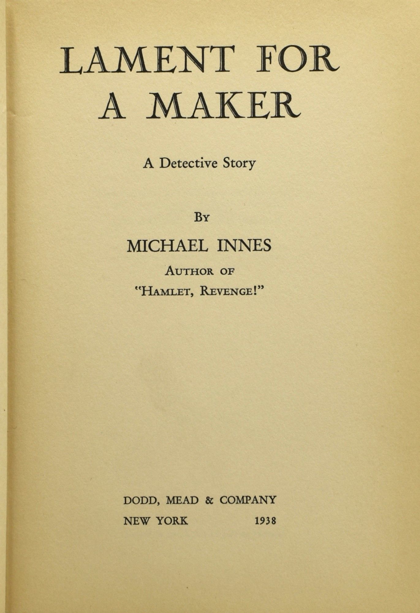 New York: Dodd, Mead & Company, 1938. First Edition. Very Good binding/Good dust jacket. An early Inspector Appleby book. This copy has shelfwear to the binding, with rubbing to the cardboard at parts of the bottom edge; there is an older bookshop sticker at the bottom of the front endpaper. There are no ownership or other marks in the book, and the binding is actually quite bright.~~The dustjacket has been reinforced -- at the spine especially -- on the verso, with paper and scotch tape. The jacket has significant rubbing with closed tears, and a chip at the bottom of the spine. It has not been price-clipped and is now protected with a mylar cover. Very Good binding / Good dust jacket.