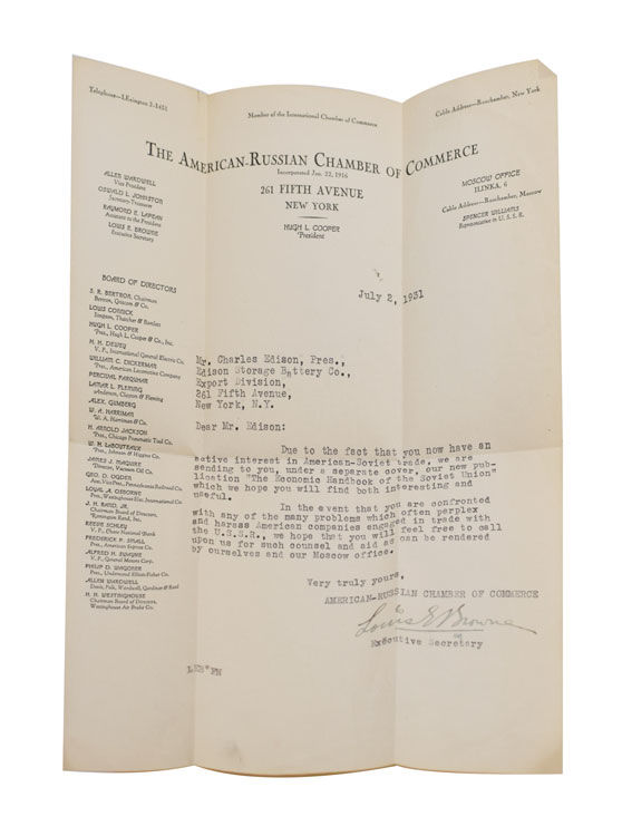 New York: American-Russian Chamber of Commerce 261 Fifth Avenue, 1931. With 2 folded color maps of European and Asiatic Soviet Union tipped in to each pastedown. 151pp. 8vo. Grey printed wrappers. Fine. With 2 folded color maps of European and Asiatic Soviet Union tipped in to each pastedown. 151pp. 8vo. With an TLS from Executive Secretary of American-Russian Chamber of Commerce Louis E. Browne to Mr Charles Edison, President of Edison Storage Battery Co. asking him to accept this publication and telling him he can fix an harrassment thta his company might encounter. In 1933 FDR's Government finally recognized the Soviet Union.