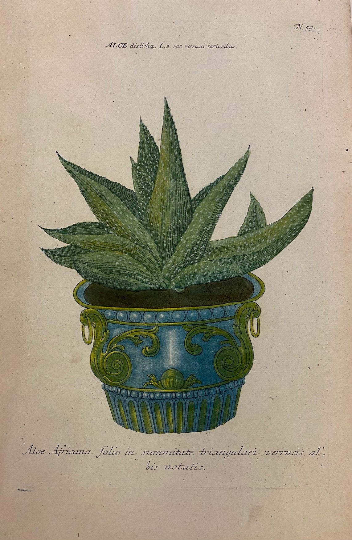 Striking depiction of the aloe plant in a decorative vessel from the four-volume study of flowers and plants, "Phytanthoza Iconographia" edited by Johann Weinmann between 1737 and 1745. Both accurate and beautiful, these prints were the first botanical color mezzotints, a revolutionary method that allowed for subtlety and detail. Weinmann (1683-1741) was a renowned pharmacist whose plant studies earned him scientific acclaim among botanists. He employed several botanical artists and engravers to assist with the project including Seuter, Johann Ridinger, Johann Jakob Haid and most notably Georg Dionysus Ehret.