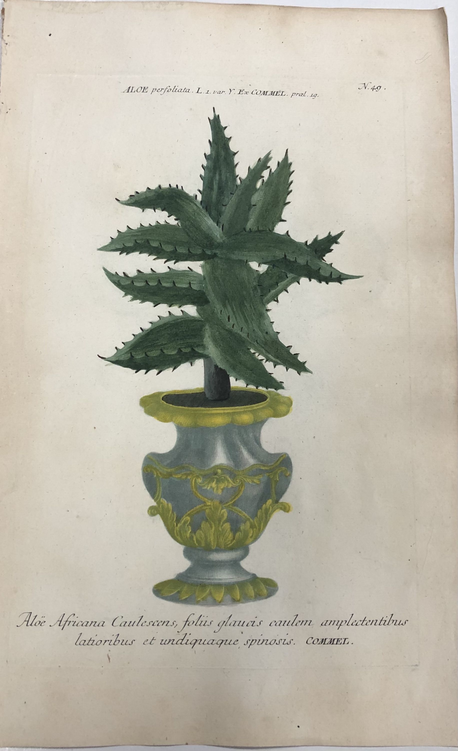 Aloe Africana caulescens folus glaucis caulem amplectentibus latioribus et undiquaque spinosis; N. 49 Aloe Perfoliata