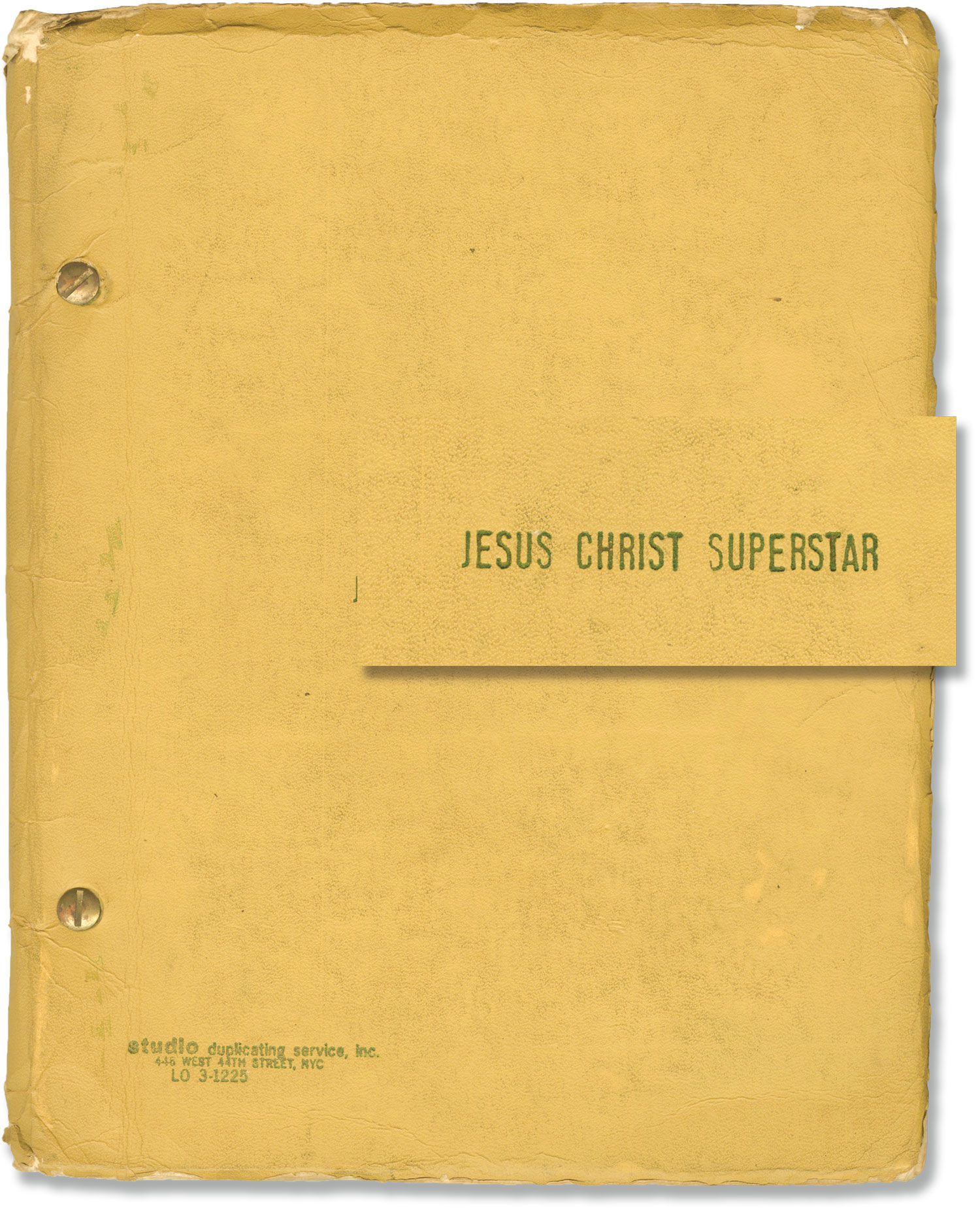Mustard titled Studio Duplicating Service wrappers. Title page present, undated, with music credits to ANDREW LLOYD WEBBER and lyrics credits to TIM RICE. 94 leaves, with last page of text numbered 2-CC-51. Xerographic duplication, rectos only. Pages Very Good plus, wrapper Very Good, lightly soiled and edgeworn, bound with two gold brads.