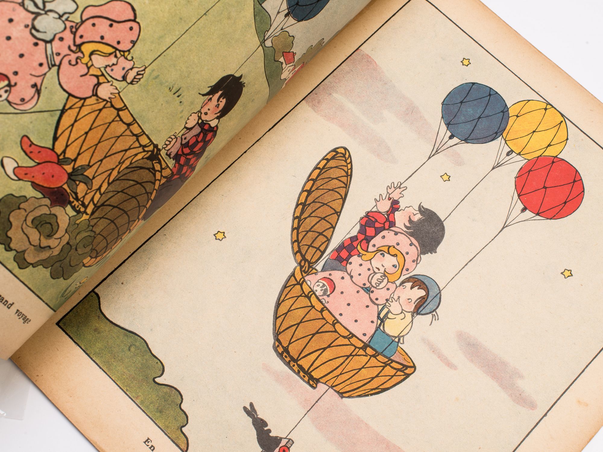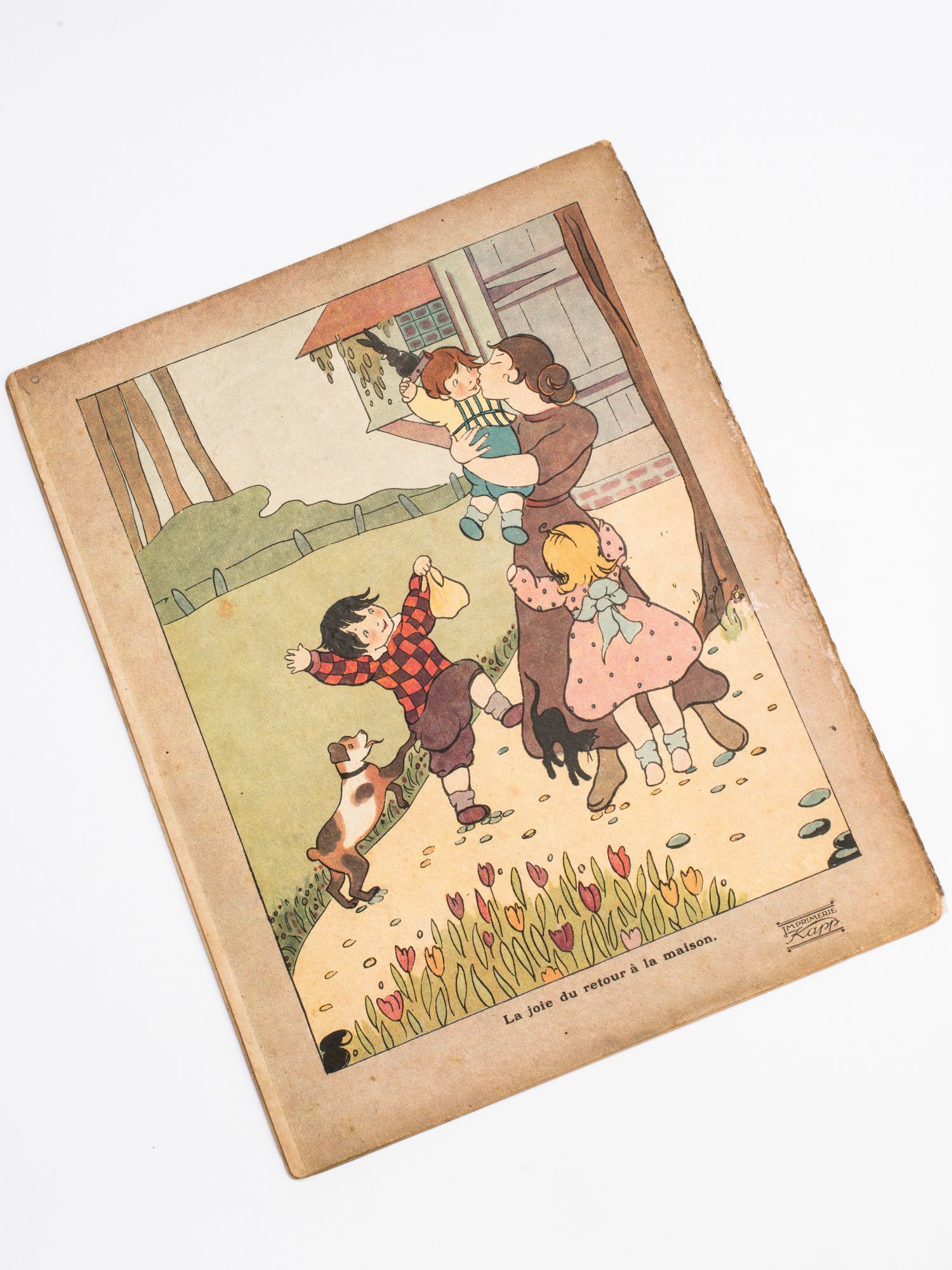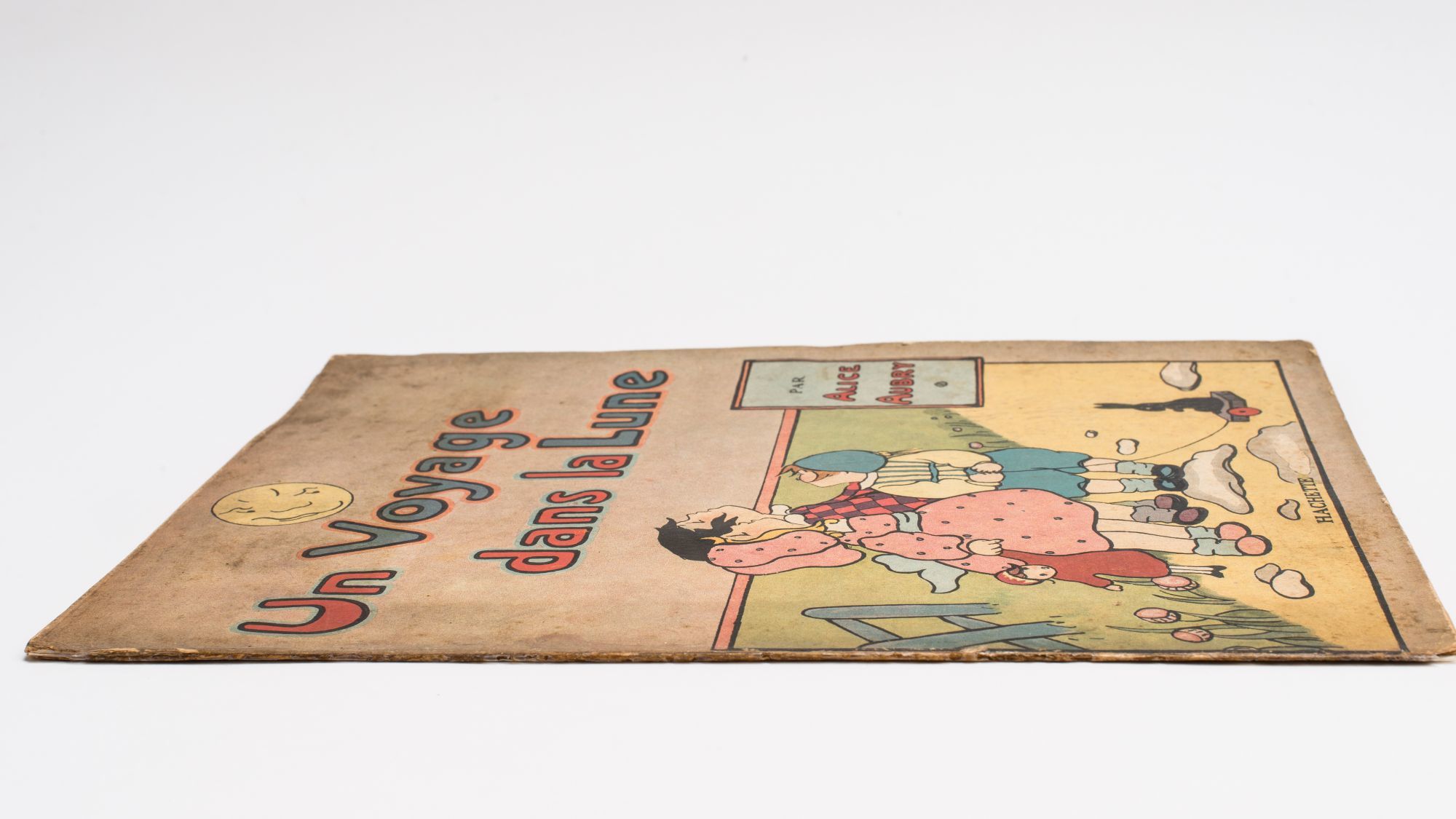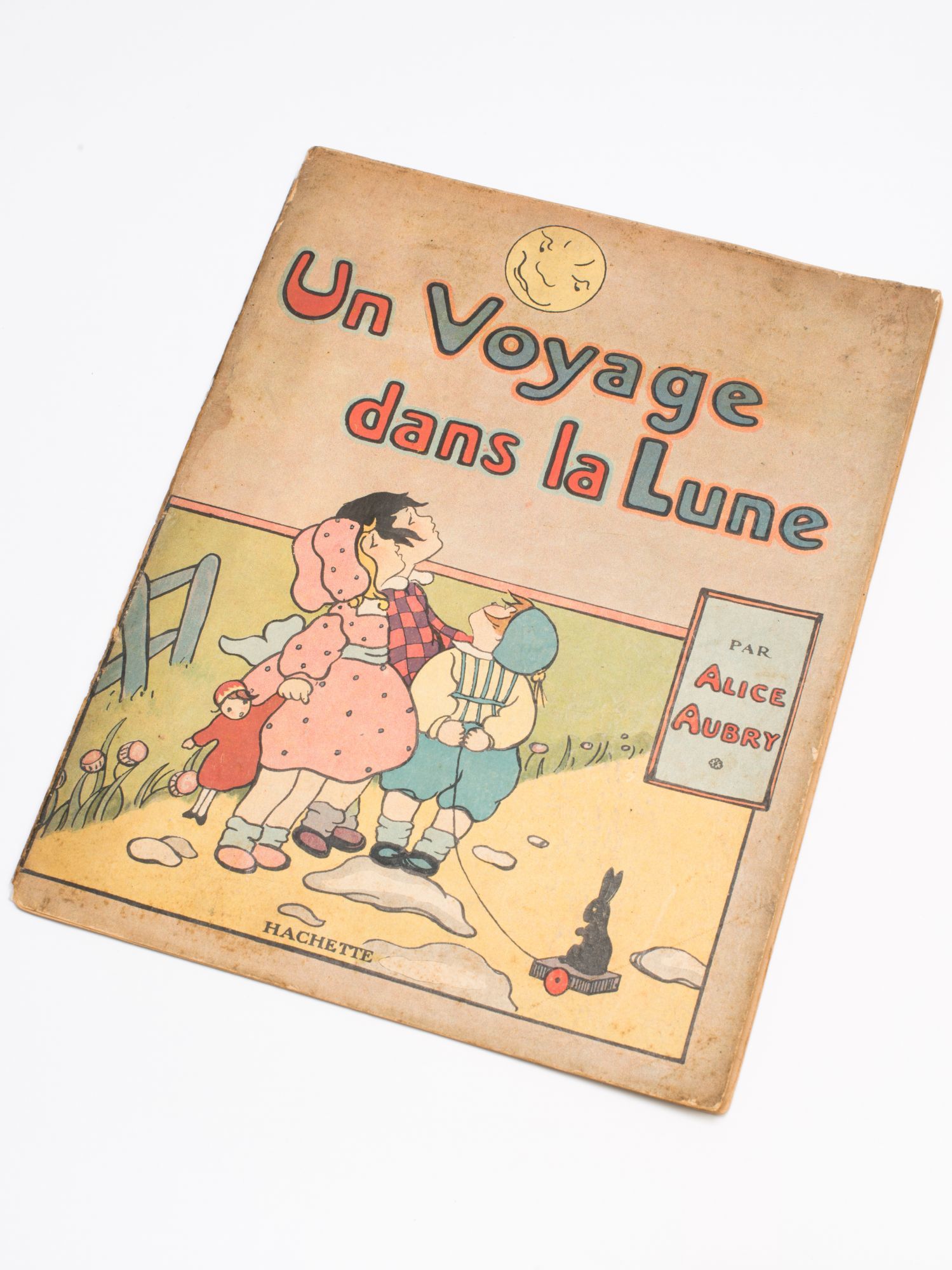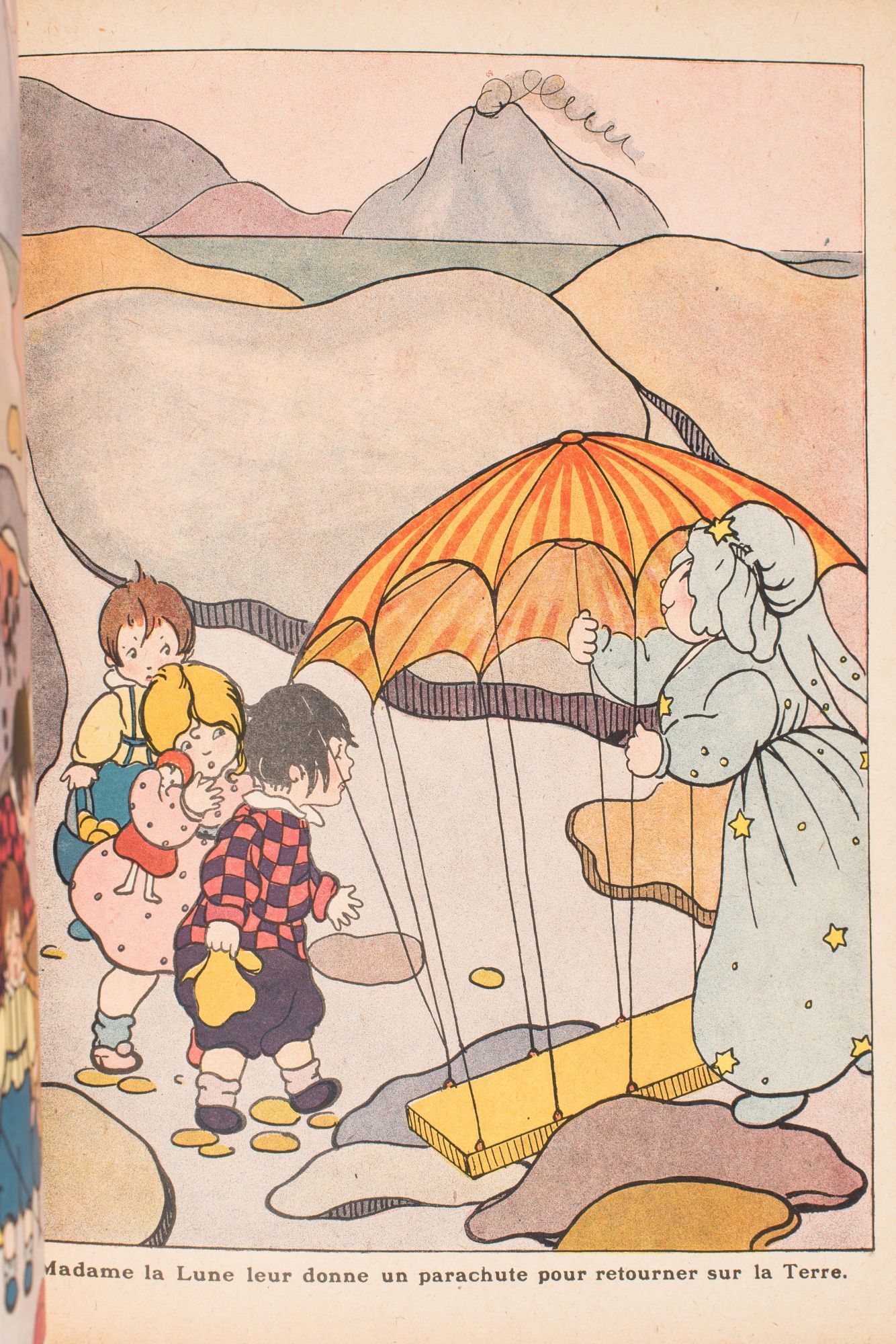 [Paris]: Hachette, 1920. Very good.. Rare French fantasy picture book about children who travel by balloon to the moon. Three children receive a warm welcome on the fantastical moon world. In a very French take on the moon voyage, the climax of activity is baking moon-themed treats. After little moon creatures destroy their balloon, the Mistress of the Moon sends them home in a parachute. The vividly stylized illustrations pair with minimalist sentences with surprising storytelling force. OCLC locates only one institutional holding (the BnF). 12'' x 9.5''. Original color pictorial wrappers. Illustrated in color on every page, including versos of wrappers. Text in French. [8] pages. Spine repaired; covers dusty and soiled around the margins.