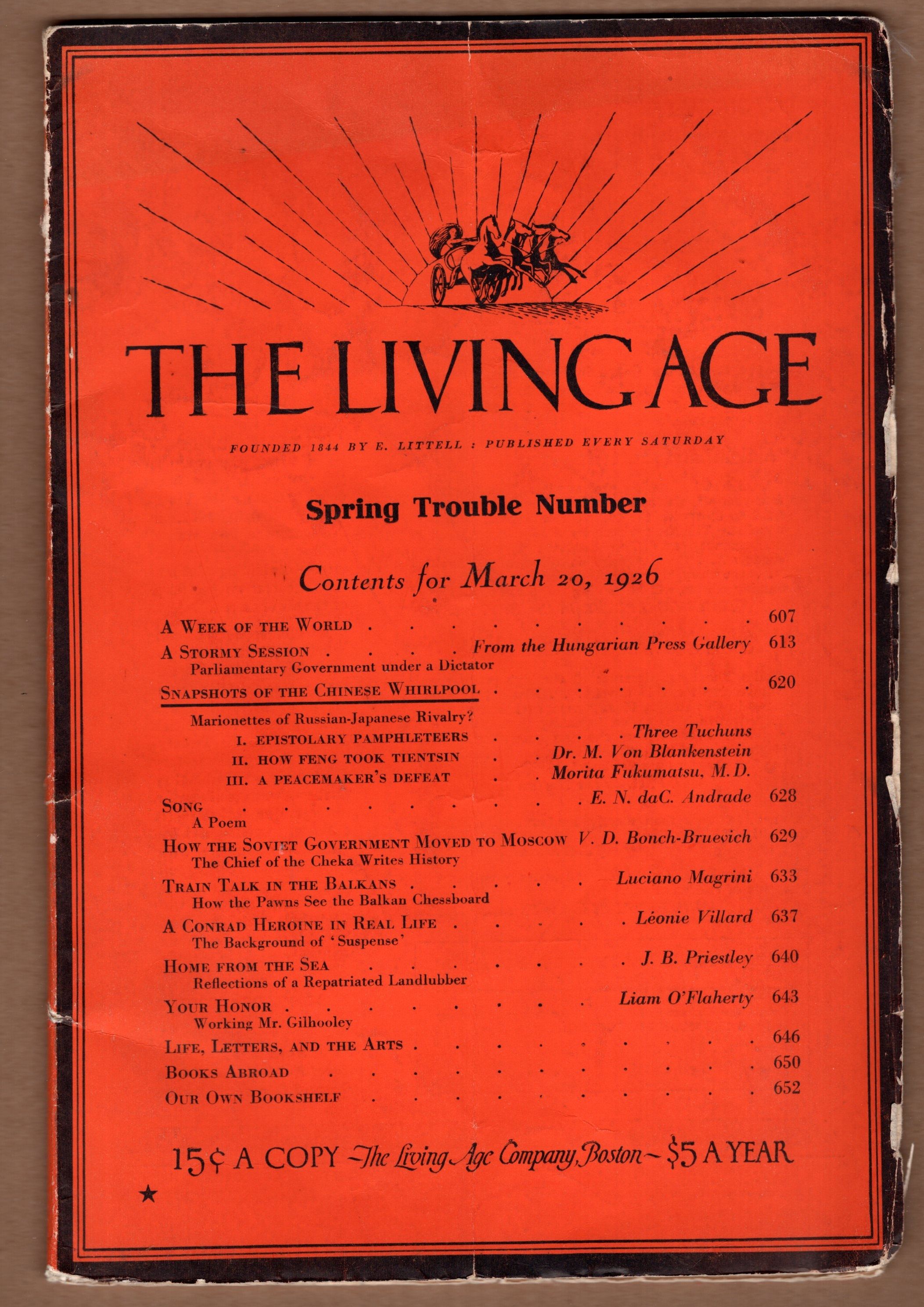 Boston: The Living Age Company , 1926 . Staplebound. Very good. p 607-652 in printed wraps. China, Japan, Blakans, Liam O'Flaherty article.